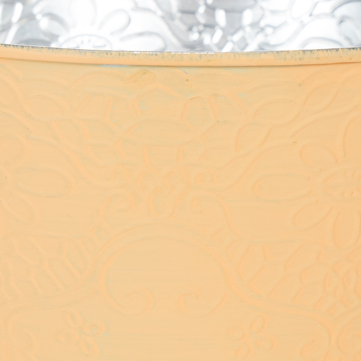 De präglade blommorna och rankorna ger blomkrukan en fantastisk vintagelook. Utsidan trivs med den trendiga pastellfärgen orange applicerad med synliga penseldrag.
