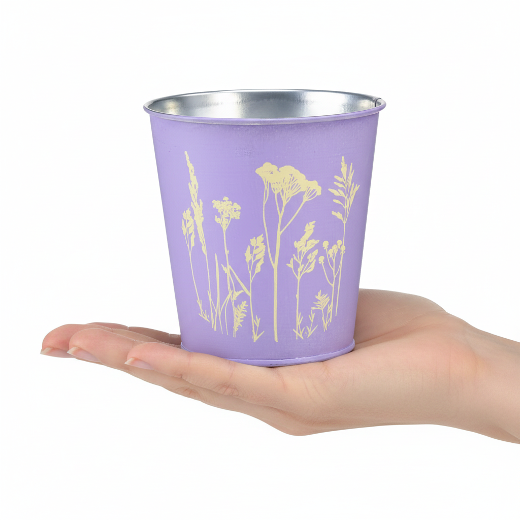 Ställ en kruka i metallkrukan och ge prästkragar och andra ängsblommor ett nytt hem med blomkrukan. Metallkrukan är dekorerad på ena sidan med blommotivet i gult, vilket får färgen på den lavendelfärgade krukan att skimra som en matt guldgul.
