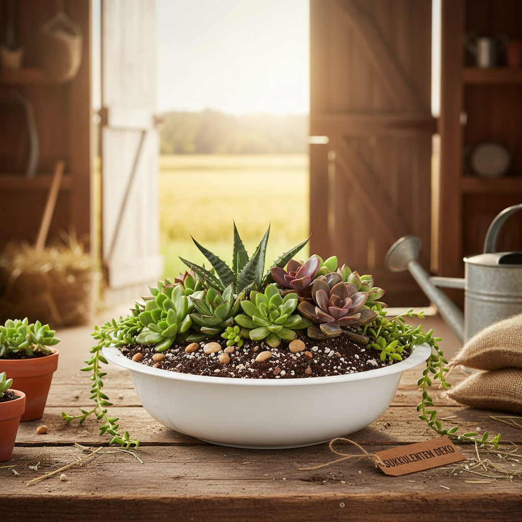 Dekorskålen lämpar sig inte bara för plantering (det är bäst att täcka blomsterskålen med folie), utan även för bordsarrangemang som du gärna vill ge en lite rustik touch.
