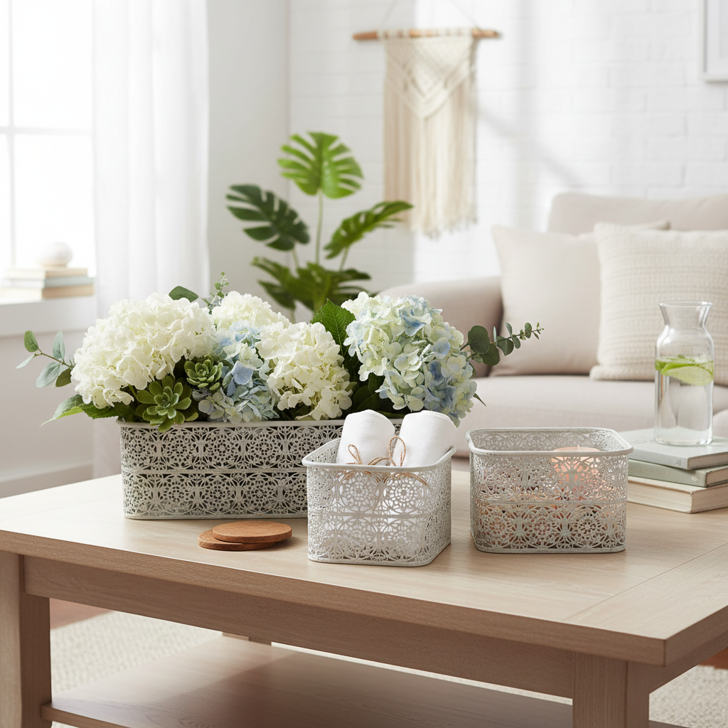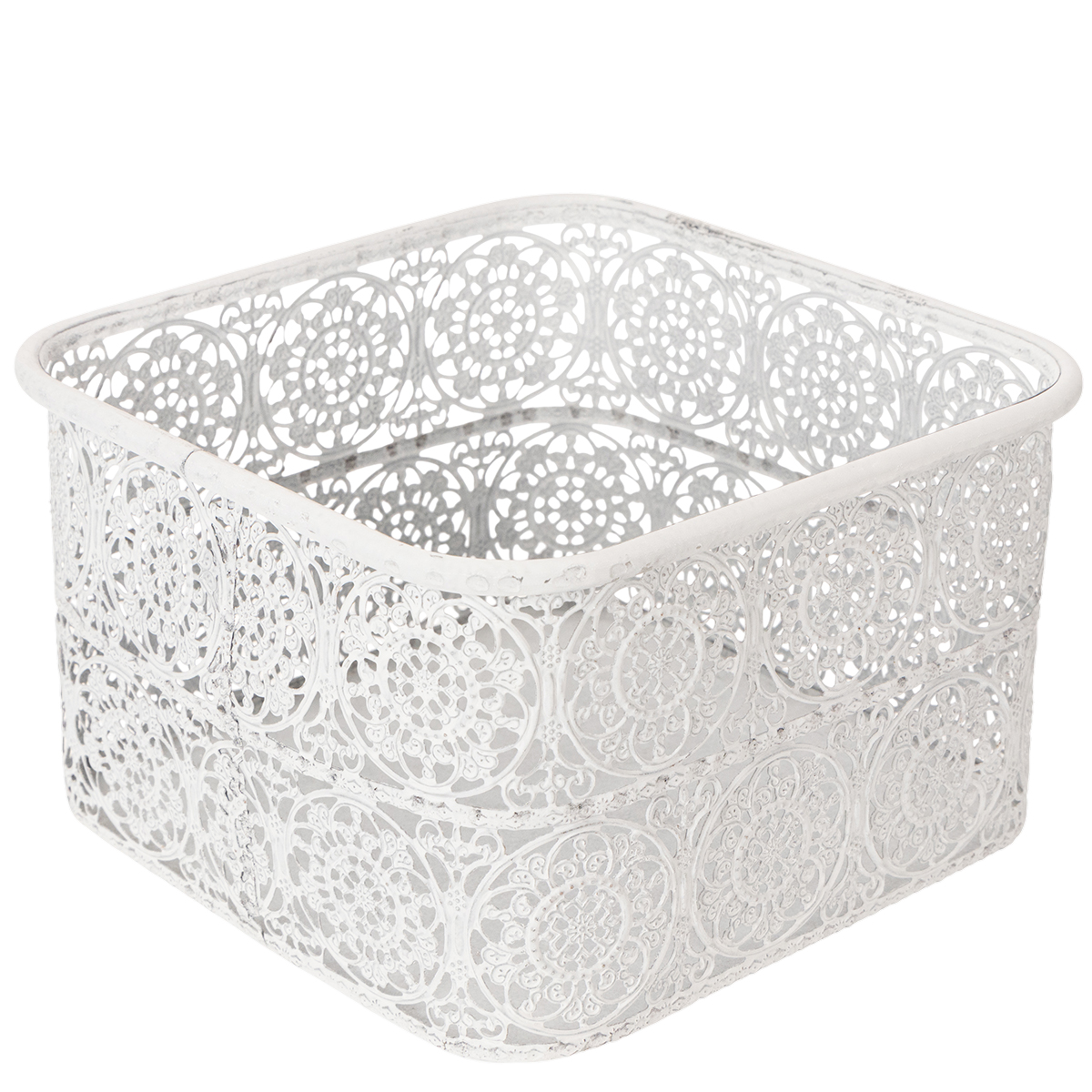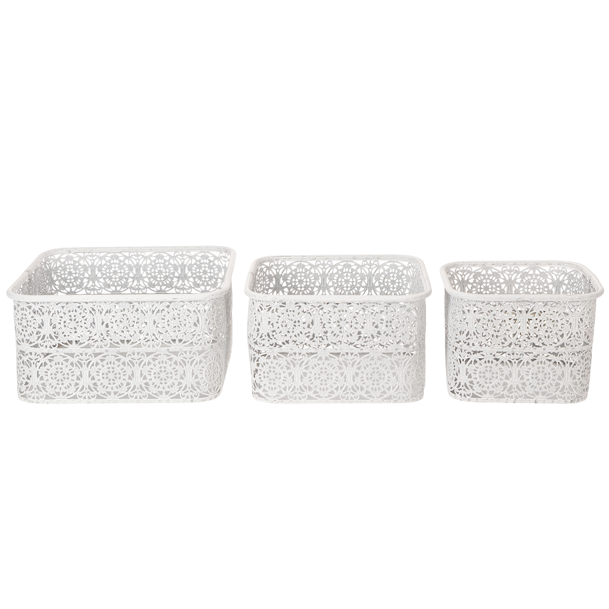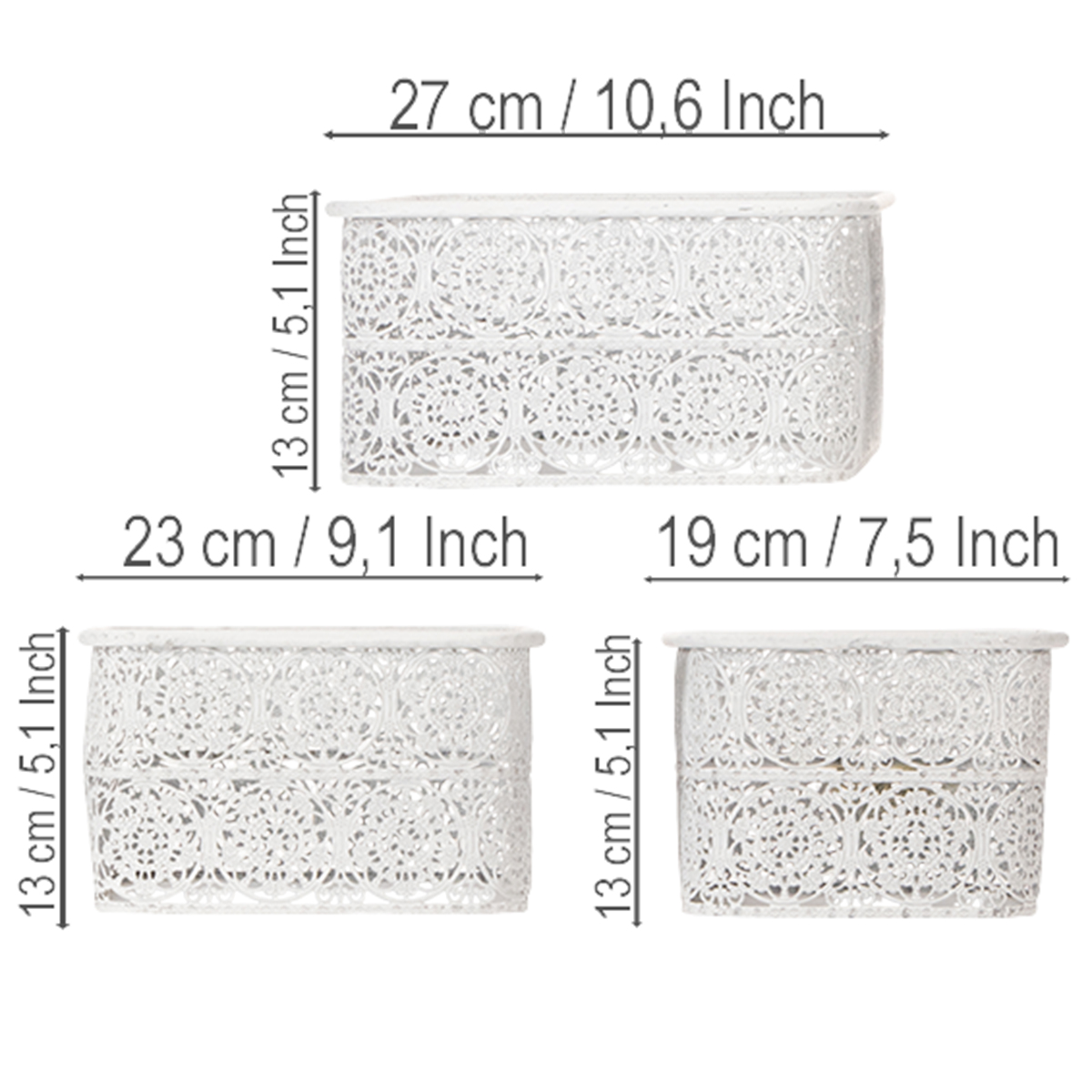 Metallskålar med spetsmönster, dekorativ behållare, fyrkantig, shabby chic, vit, 27/23/19 cm, H13,5 cm, set om 3