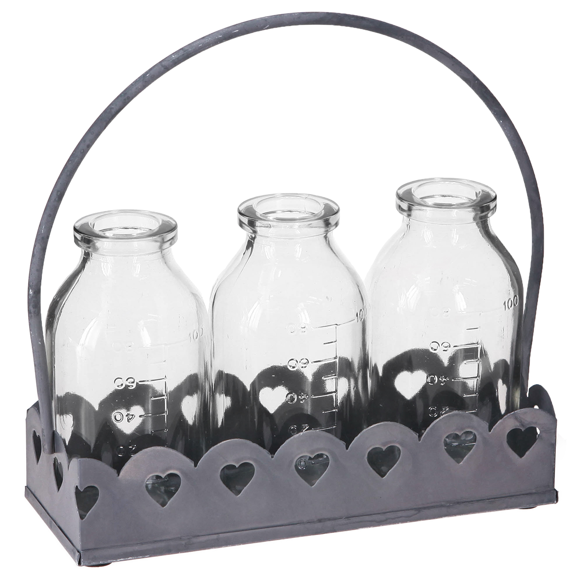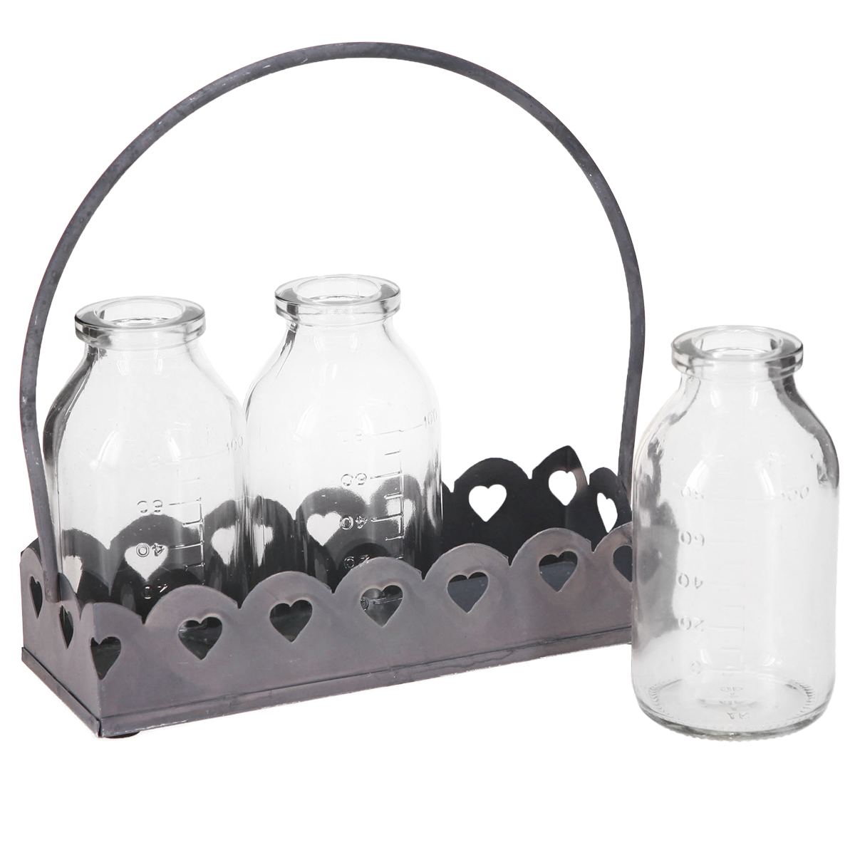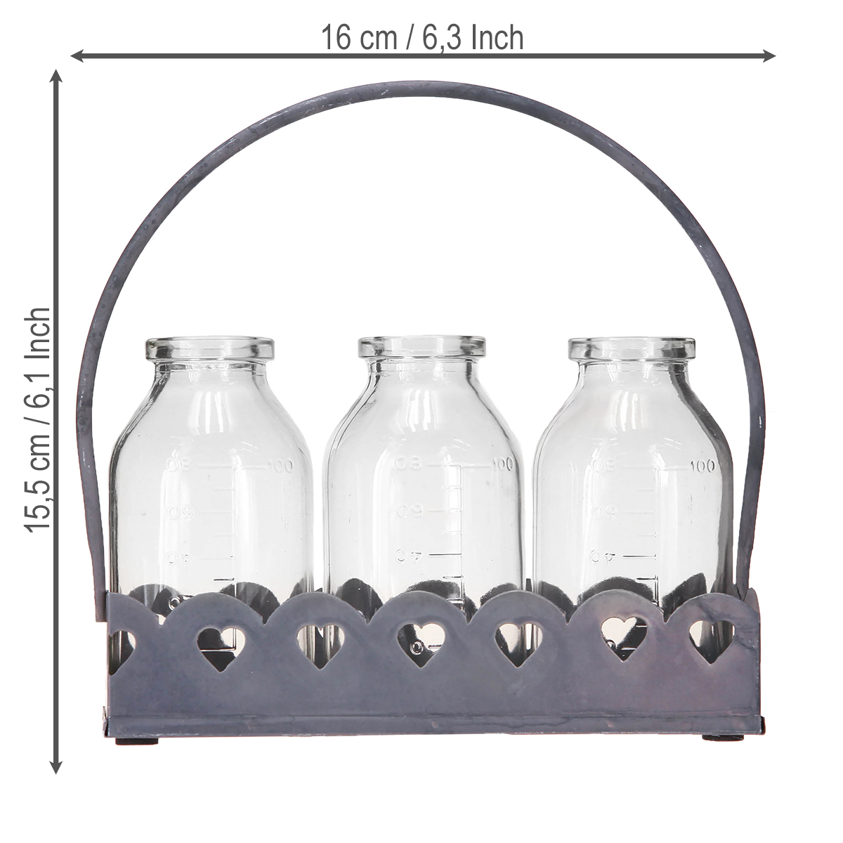 Upplev den magiska attraktionskraften hos miniflaskdekorationer som vaser på en bricka. Dessa charmiga dekorativa flaskor är perfekta för att lägga till en touch av nostalgi till ditt vardagsrum. Var och en av de tre glasvaserna påminner om antika apotekarflaskor och är placerade på en stadig, grå metallbricka med utstansade hjärtmotiv. Denna detalj i retrostil lägger till en romantisk touch till arrangemanget, vilket gör det idealiskt för bröllopsdekorationer, mysiga bordsdekorationer eller som en presentidé. Måtten på flaskorna öppnar upp för en mängd olika användningsområden, från att snabbt plantera små blomsterarrangemang till att lagra örter eller hantverksmaterial.