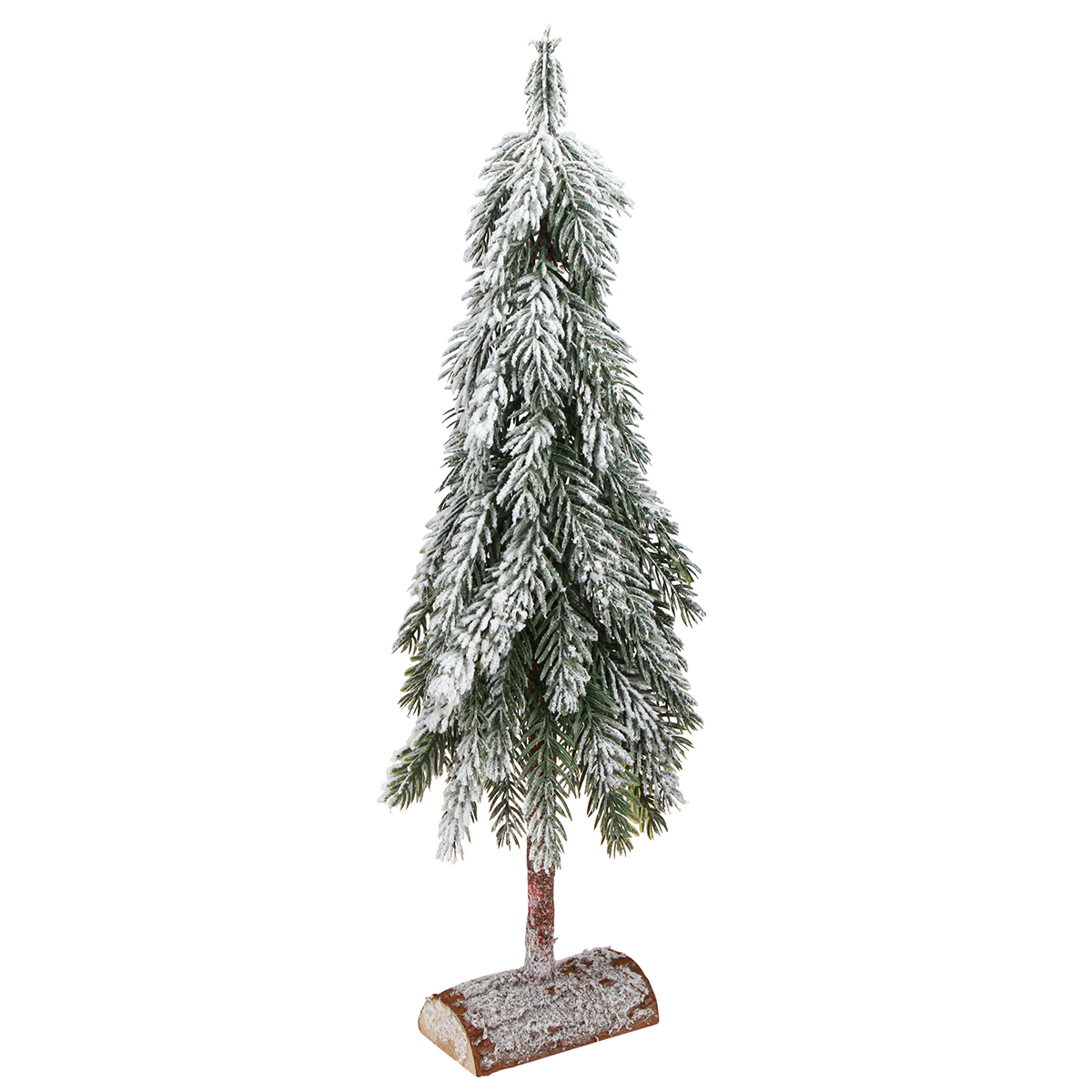 Minijulgranen med gröna barr är täckt med fin konstsnö och vilar på en konstfullt utformad bas gjord av en gren som är halverad på längden. Den röda konstgjorda stammen är flockad brun och vit, vilket skapar en autentisk men elegant vinterlook. Träbasen, även den dekorerad med konstsnö, ger denna konstgjorda julgran stabilitet och gör den till höjdpunkten i din bordsdekoration på vintern.