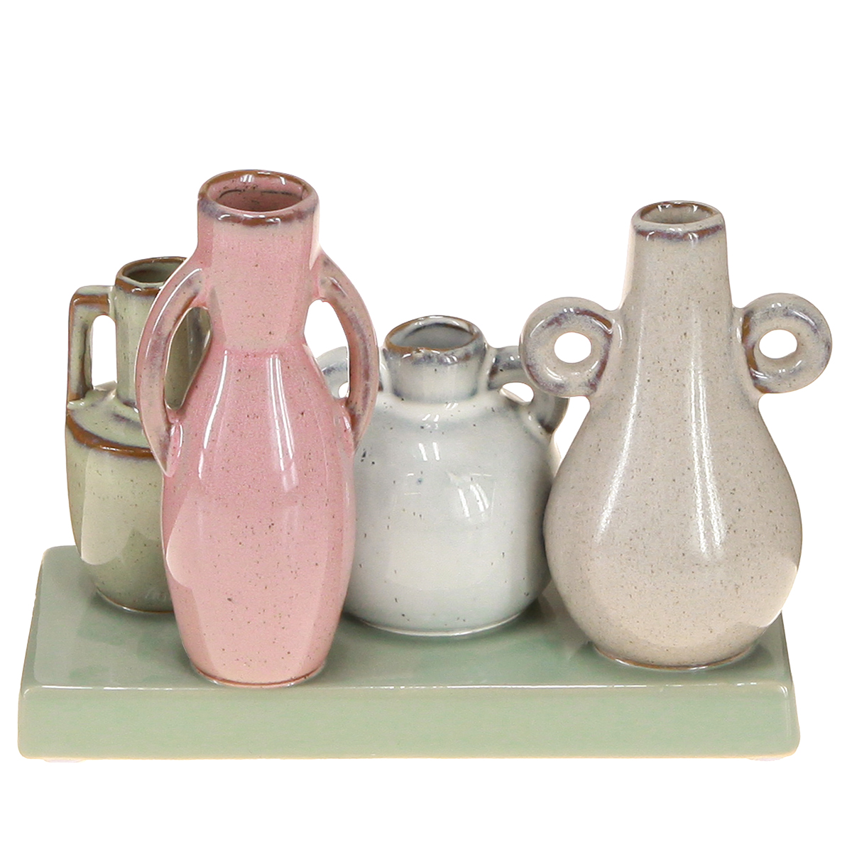 Hur mycket charm kan ett litet tillbehör utstråla? Helt otroligt mycket! Detta minivasset i keramik ger inte bara praktisk funktionalitet, utan framför allt ren elegans och mysighet till ditt hem. Oavsett om du vill försköna din matplats eller skapa en elegant accent i ditt vardagsrum – dessa små vaser är sanna allroundare. Den harmoniska färgpaletten i rosa, grönt och vitt smälter enkelt in i olika inredningsstilar och skapar en atmosfär som känns tidlöst modern. Kanske vill du varsamt inreda ditt sovrum med delikata blommiga accenter? Tack vare sin kompakta storlek passar setet även perfekt på ett nattduksbord eller fönsterbräda. Gör dig redo för en riktig höjdpunkt i din heminredning som är både minimalistisk och dekorativ.