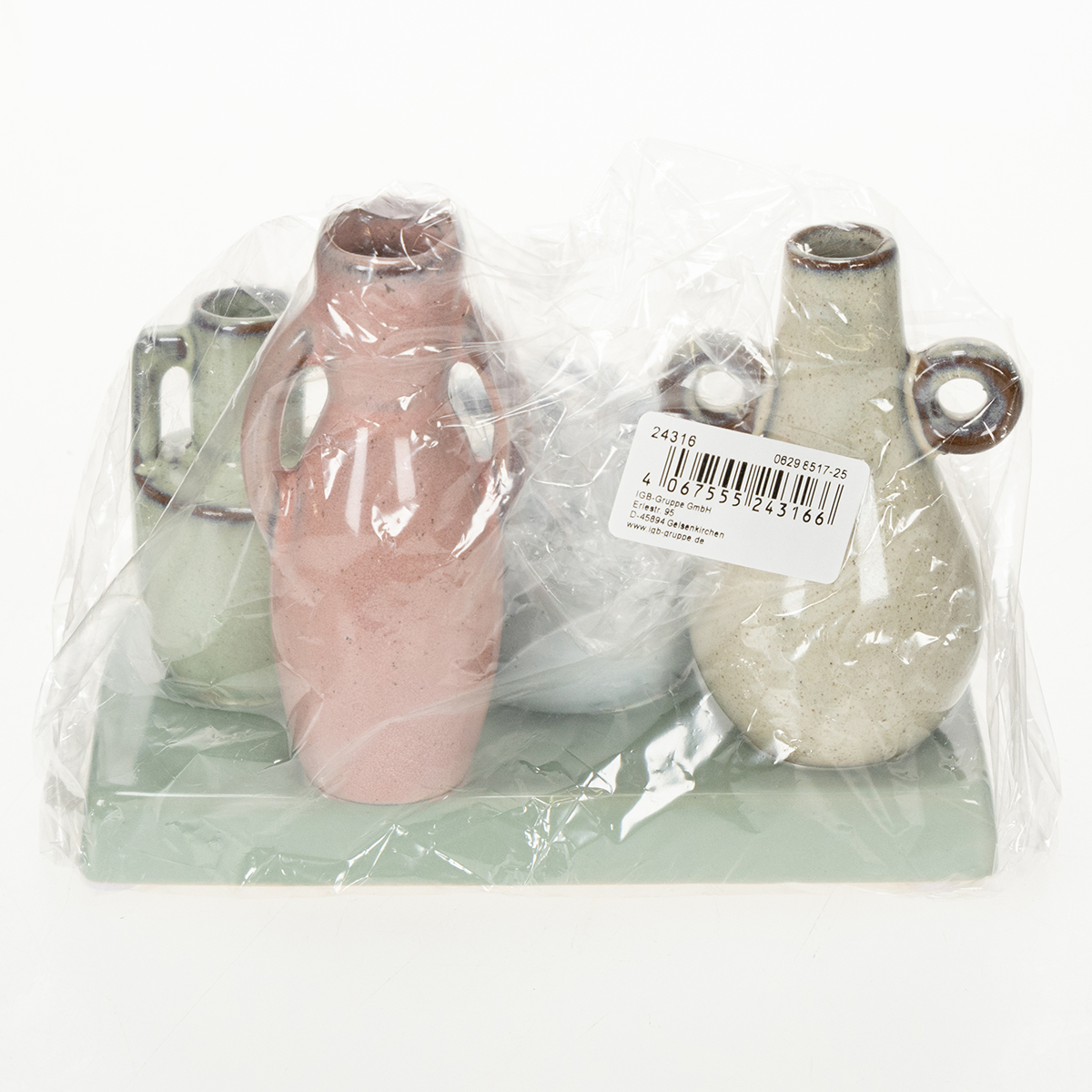 Hur mycket charm kan ett litet tillbehör utstråla? Helt otroligt mycket! Detta minivasset i keramik ger inte bara praktisk funktionalitet, utan framför allt ren elegans och mysighet till ditt hem. Oavsett om du vill försköna din matplats eller skapa en elegant accent i ditt vardagsrum – dessa små vaser är sanna allroundare. Den harmoniska färgpaletten i rosa, grönt och vitt smälter enkelt in i olika inredningsstilar och skapar en atmosfär som känns tidlöst modern. Kanske vill du varsamt inreda ditt sovrum med delikata blommiga accenter? Tack vare sin kompakta storlek passar setet även perfekt på ett nattduksbord eller fönsterbräda. Gör dig redo för en riktig höjdpunkt i din heminredning som är både minimalistisk och dekorativ.