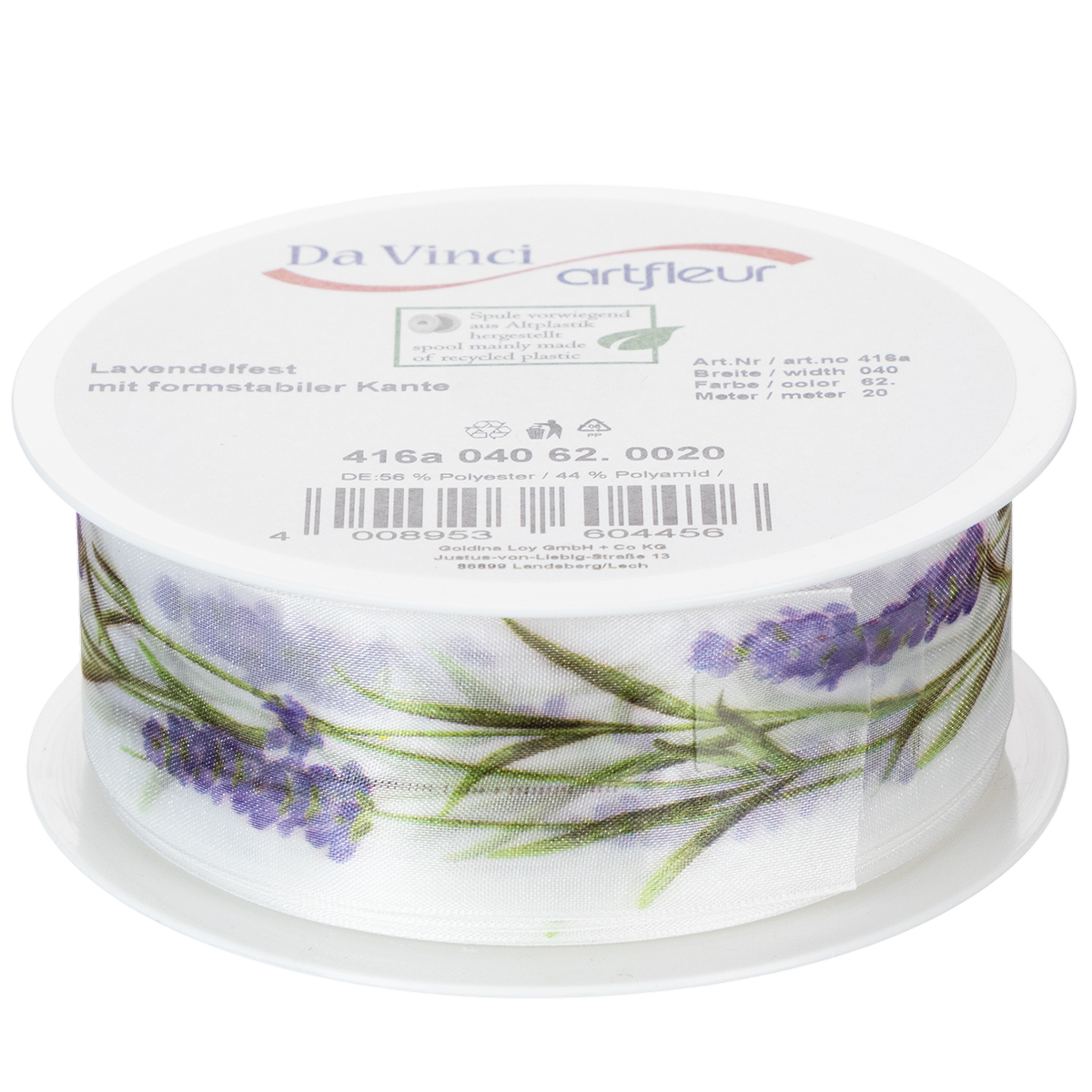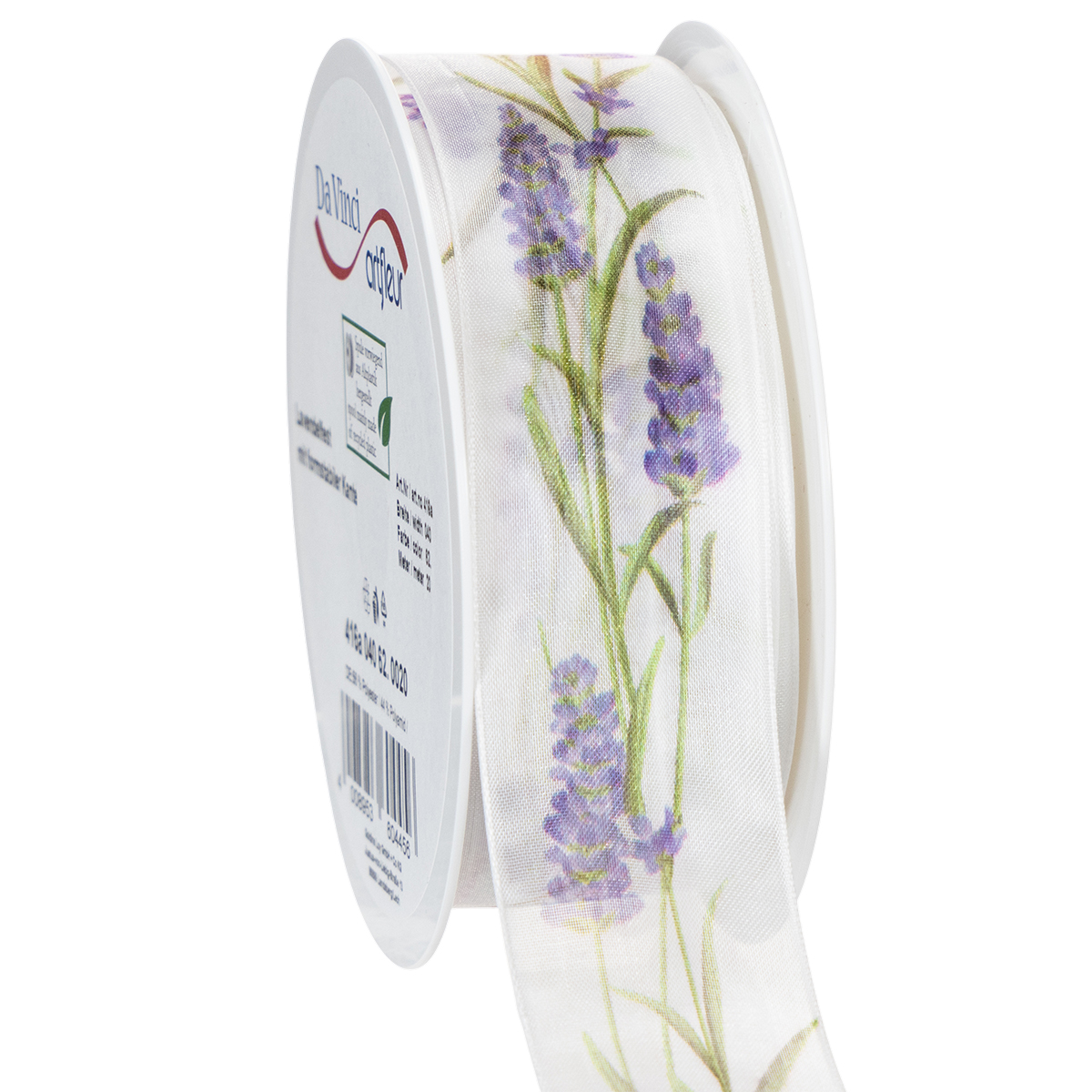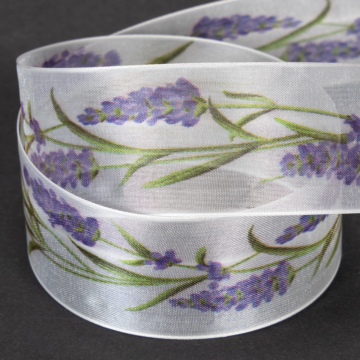 Lavendelmotivet ser fräscht och färgglatt ut på den vita bakgrunden av organzabandet. Med sin transparenta organzaväv är chiffongbandet lätt och har ett karakteristiskt skimmer, medan de formbevarande kanterna ser till att rosetter ser pittoreska ut.