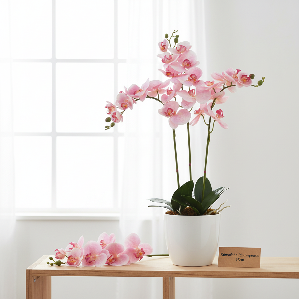 På grund av sin blomprakt är denna orkidé från släktet Phalaenopsis en förstklassig konstgjord blomma. Skapa bestående dekorationer även i ljuslösa rum med den stora konstgjorda blomman!