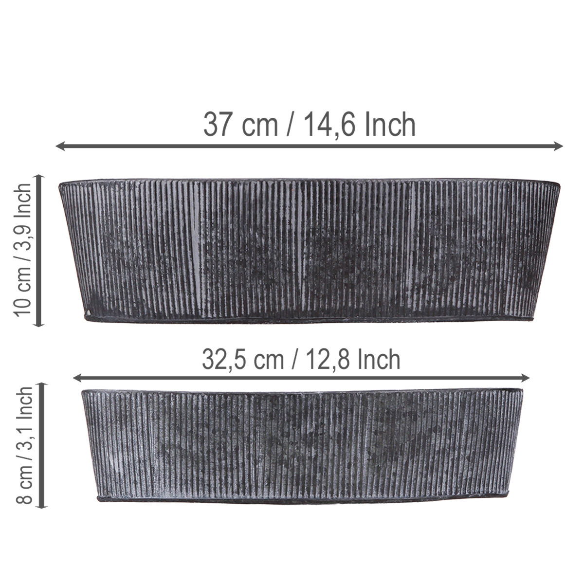 Den ovala skålen av metall och svart kombinerar stilfull elegans med en charmig vintage-estetik som kommer att förhöja ditt hem. Oavsett om det är en iögonfallande dekorativ skål, som en nostalgisk bordsdekoration eller som en rustik blomsterskål – denna uppsättning med två stapelbara metallskålar öppnar upp för många kreativa möjligheter. Det eleganta färgschemat i svart, tvättat grått, såväl som den fina spårdesignen harmoniserar perfekt med vilken shabby chic eller industriell interiör som helst. Använd skålarna som växtskålar och lägg till en grön highlight med krukväxter eller örter. Den mindre är perfekt för snygg nyckelförvaring eller för suckulenter.