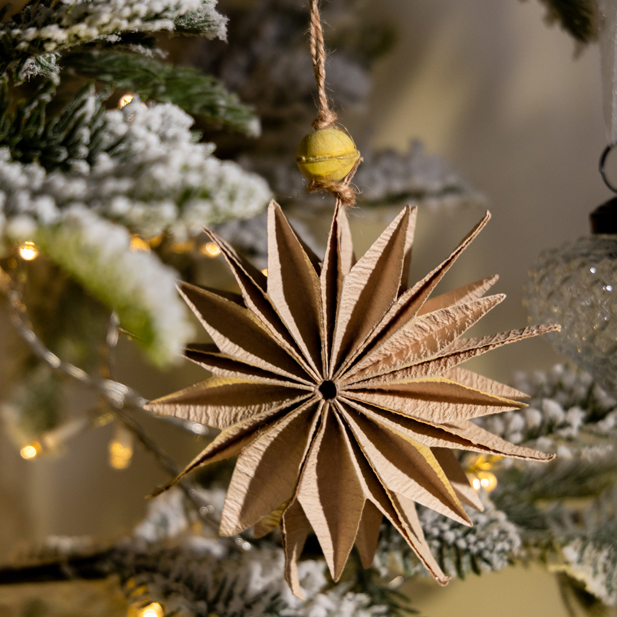 Dessa stjärnor i naturligt brunt papper erbjuder diskret elegans – perfekta för dig som älskar naturmaterial och en avslappnad atmosfär. Oavsett om de används som fönsterdekorationer, julgransprydnader eller dörrkransar är dessa pappersstjärnor mångsidiga. Med en diameter på cirka 10 cm och en charmig gul polystyrenpärla ger dessa ornament en elegant touch.