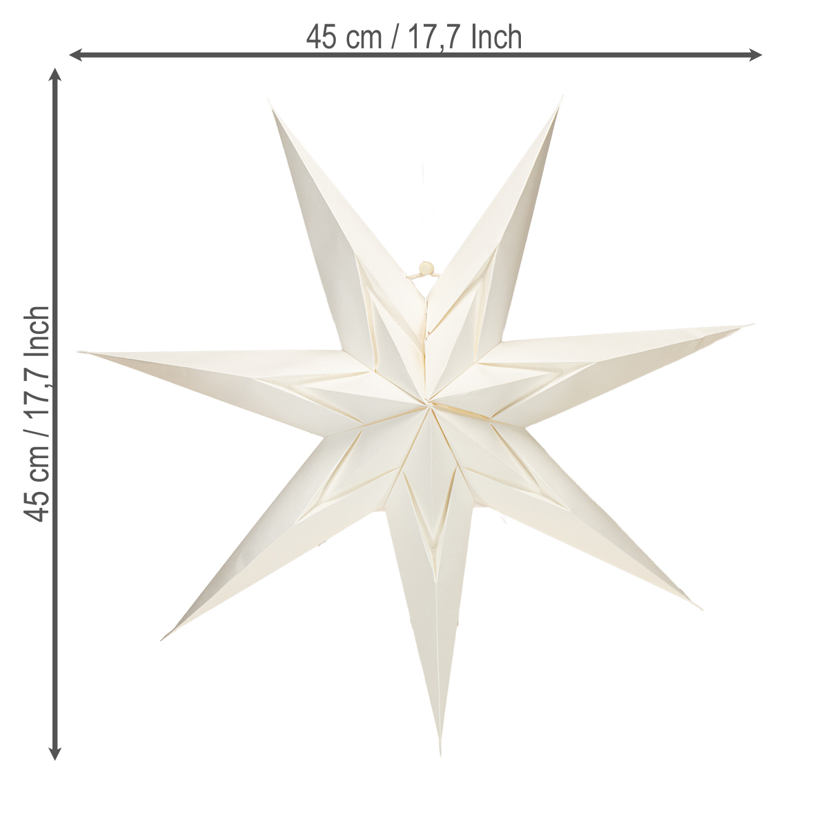 Bara deras storlek på 45 cm gör dem iögonfallande, och den eleganta designen smälter harmoniskt in i en mängd olika stilar, från tidlös skandinavisk design till moderna juldekorationer. Har du redan en idé om var du skulle kunna hänga dessa pappersstjärnor i ditt hem?