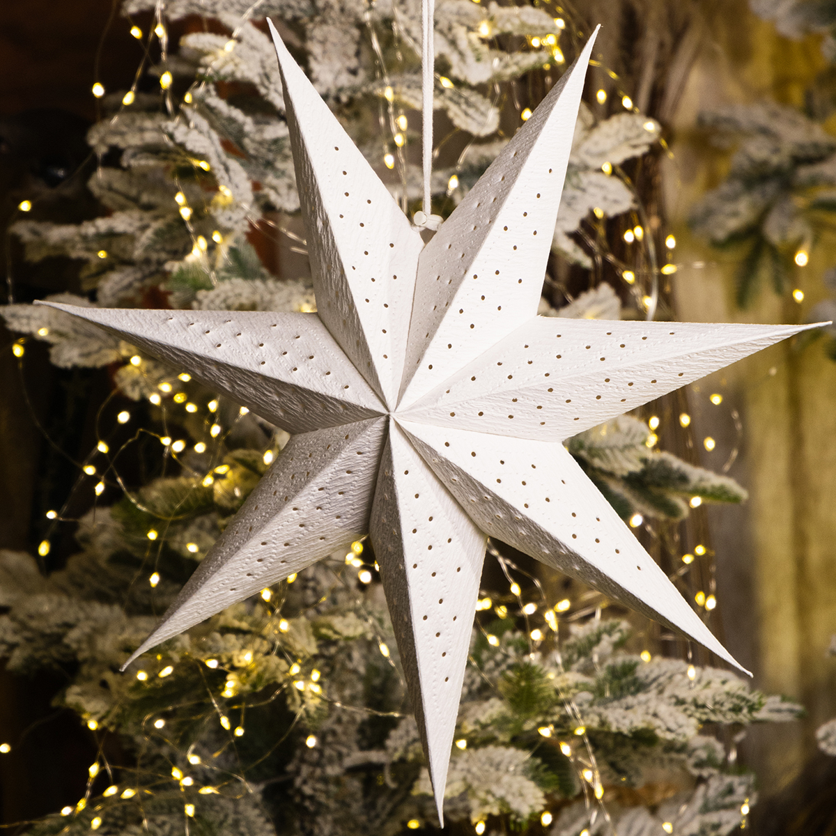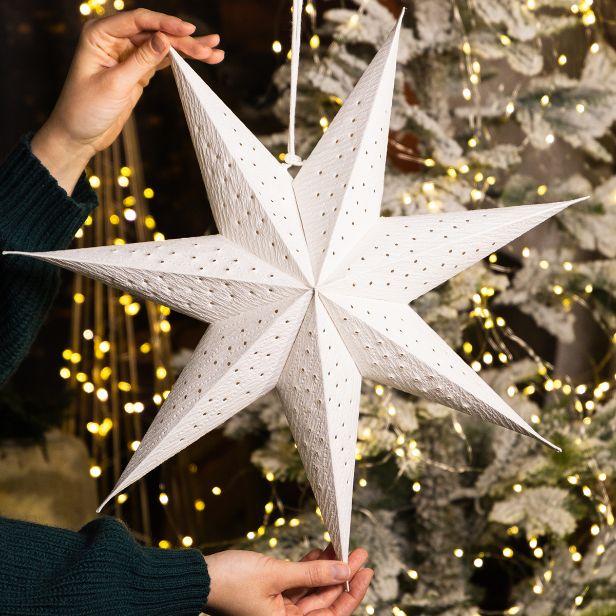 Dessa pappersstjärnor imponerar inte bara med sin attraktiva design utan även med sina genomtänkta detaljer. Tillverkade av robust papper är de hållbara nog att pryda dina juldekorationer år efter år. Med sina 45 cm i storlek ser de fantastiska ut i ett fönster, men kan också användas som elegant belysning ovanför matbordet eller som unika julgransprydnader. De som föredrar ett enklare, mer naturligt utseende kommer att älska de vita stjärnorna. De harmoniserar vackert med grangrenar, snötäckta konstgjorda växter, diskreta julgranskulor eller andra pappersdekorationer.
