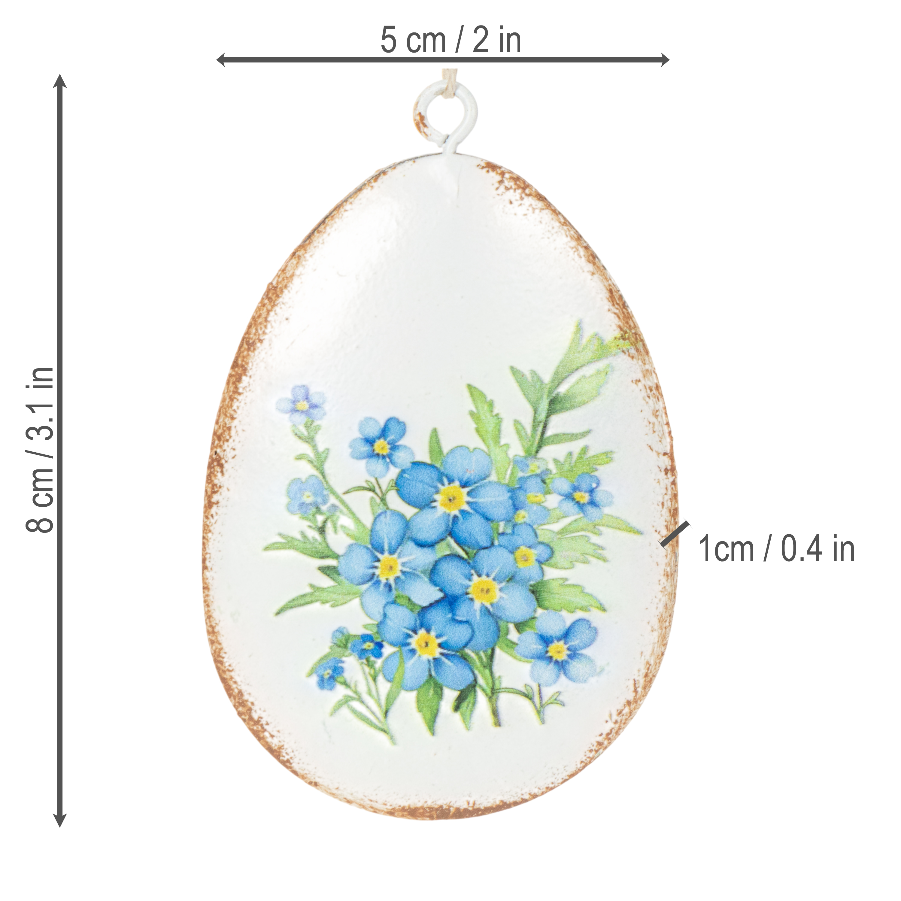 Dessa dekorativa påskägg i metall imponerar med sin storlek och sitt utseende. Med en höjd på 8 cm och en diameter på 5 cm har de den perfekta storleken för en mängd olika användningsområden. Den lätt matta vita basen kompletteras av fyra olika blommotiv som väcker våren till liv: från fina förgätmigej till livfulla påskliljor. Deras subtila vintage-look gör dem särskilt smakfulla och en perfekt matchning för retro-, shabby chic- eller lantlig dekoration.