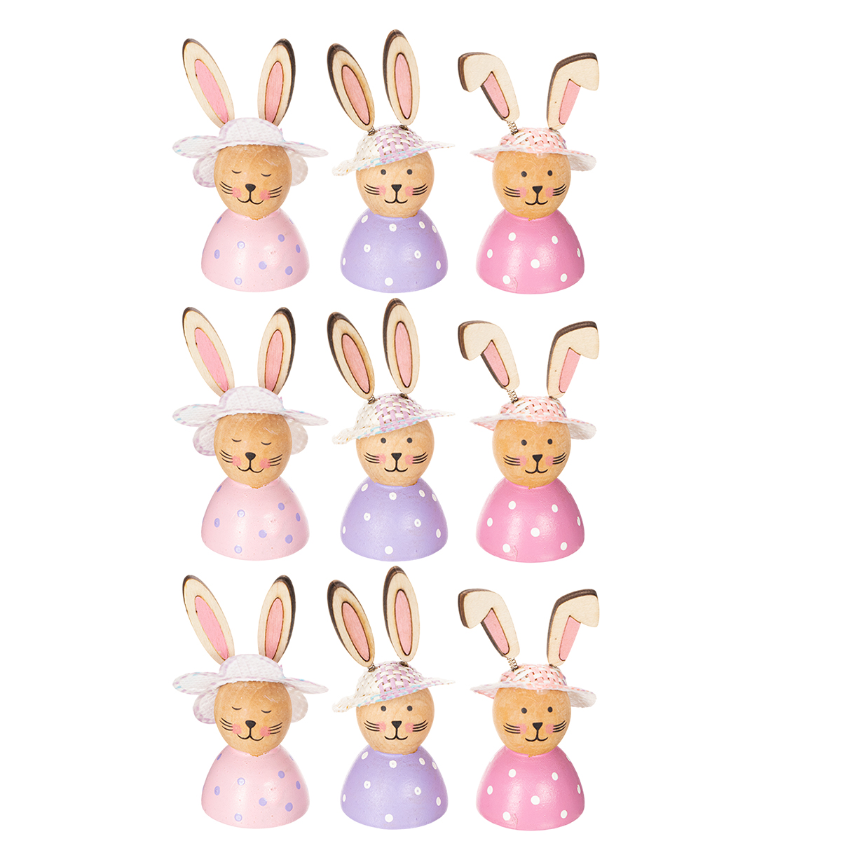 Produktnamn: Påskharebordsdekoration för våren, dekorativa kaniner med hattar, 7 cm, 9 stycken