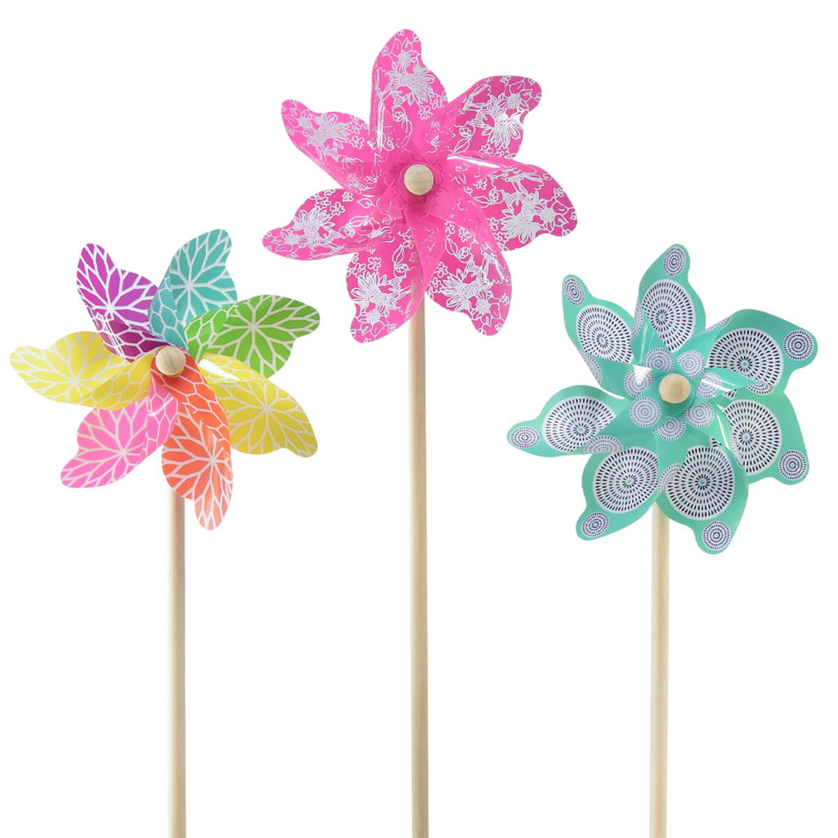 Du får totalt 3 vindturbiner som skiljer sig åt i mönster och färg. En väderkvarn är rosa och dekorerad med ett delvis genomskinligt blommönster. Den turkosa pinwheelen har svarta och vita cirklar och den tredje har en annan färg på varje blad, punkterad med en stor blomma kantad i vitt.