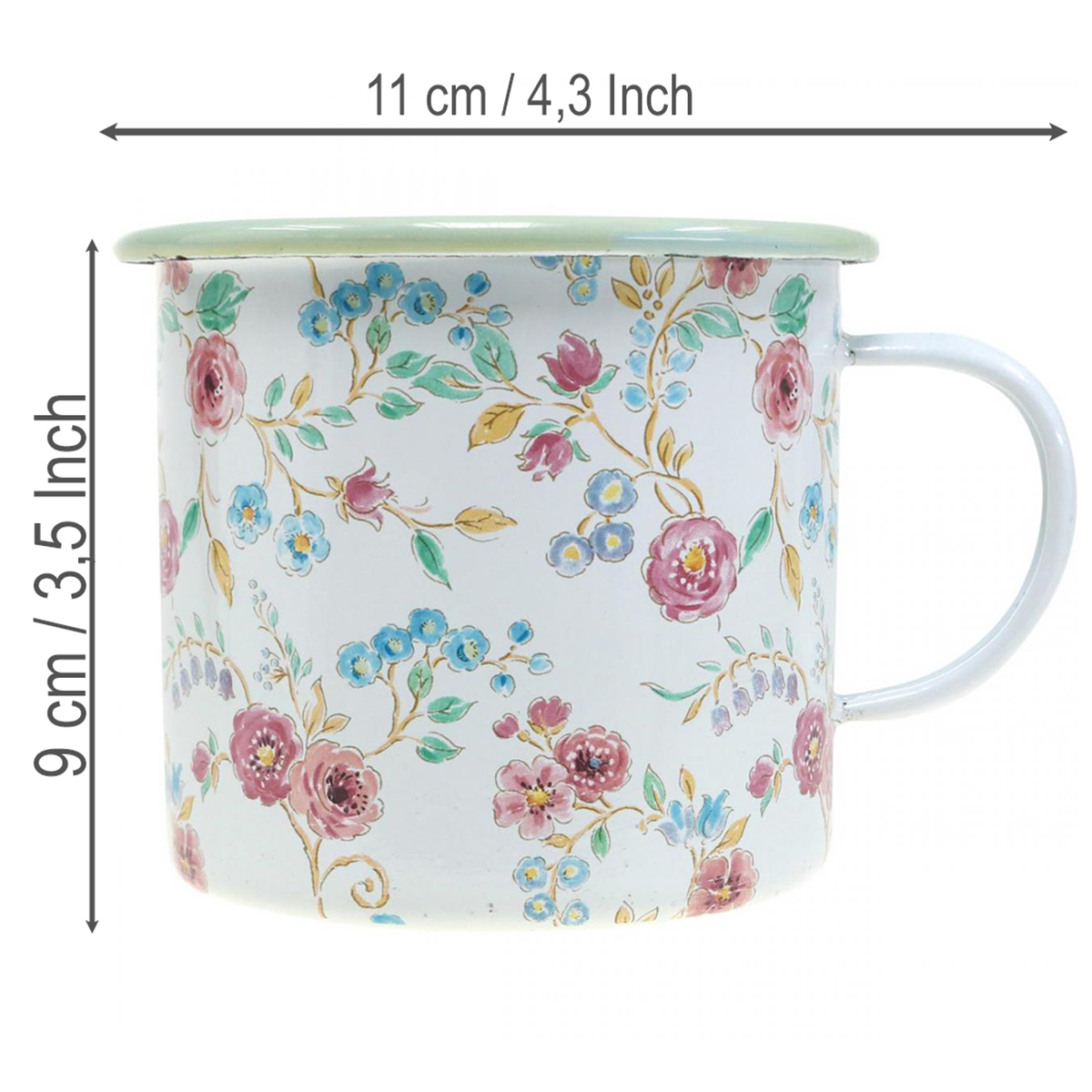 I ljusa pastellfärger på vit bakgrund erbjuder planteringskrukan med rosor emaljdekor som nostalgiskt frammanar sommaren. Dekormuggen med handtag har en pastellfärgad kant i ljusgrönt och är tryckt runt om på utsidan med ett rikt utsmyckat blommotiv. Den planterbara koppen kan fyllas med ett tunt lager grus eller sand som dränering och jord, eller med torrt eller blött blomskum.