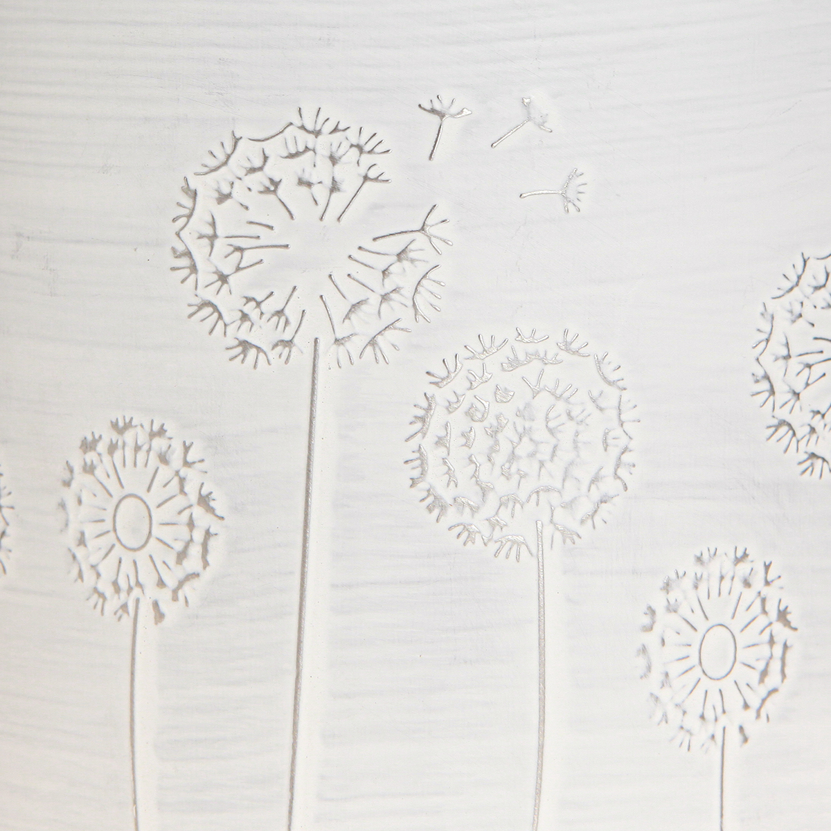 Metallgrytan är cylindriskt utformad som en hink utan handtag. Maskrosorna i olika storlekar är präglade, hela dekorationskrukan är vitmålad på utsidan och har metallens naturliga silverfärg på insidan.