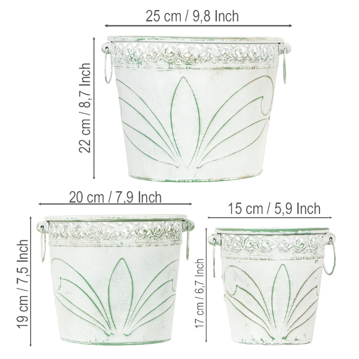 Dessa präglade plåthinkar inspirerar å ena sidan med sitt blommiga präglade motiv och den stora stansade kanten gjord av rankliknande ornament. Dessutom är planteringskärlen med handtag i grönt och vitt designade i trendig shabby chic, vilket ger dem en fantastisk antik look.