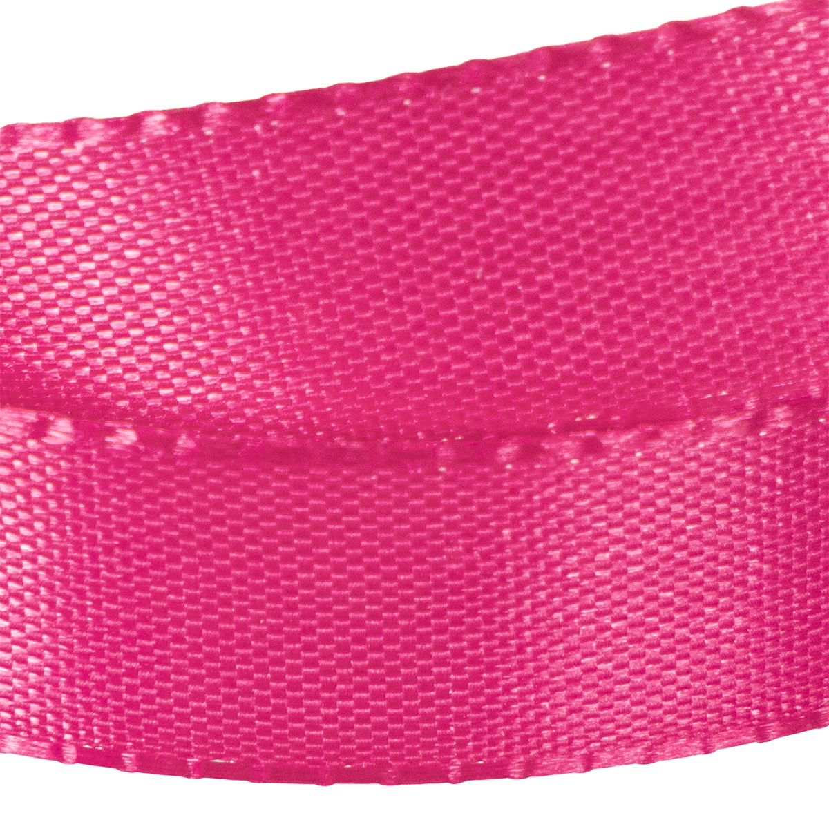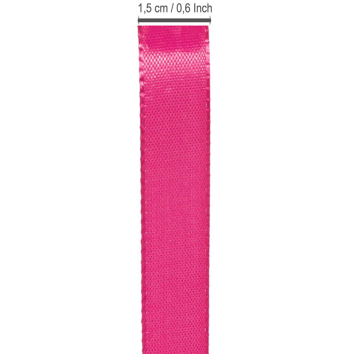 Det rosa present- och dekoreringsbandet mäter ungefär 15 millimeter i bredd och cirka 50 meter i längd. Den är tillverkad av 100% polyamid och levereras till dig på en plastspole.
