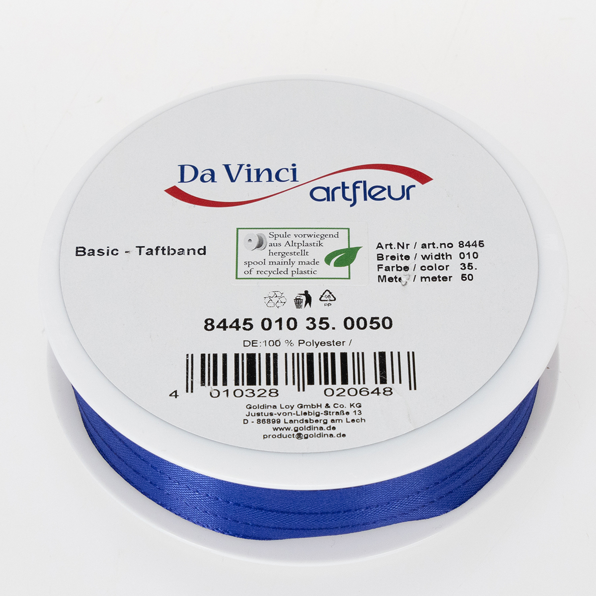 Gåvo- och dekorationsbandet i mörkblått är 10 millimeter brett och cirka 50 meter långt.