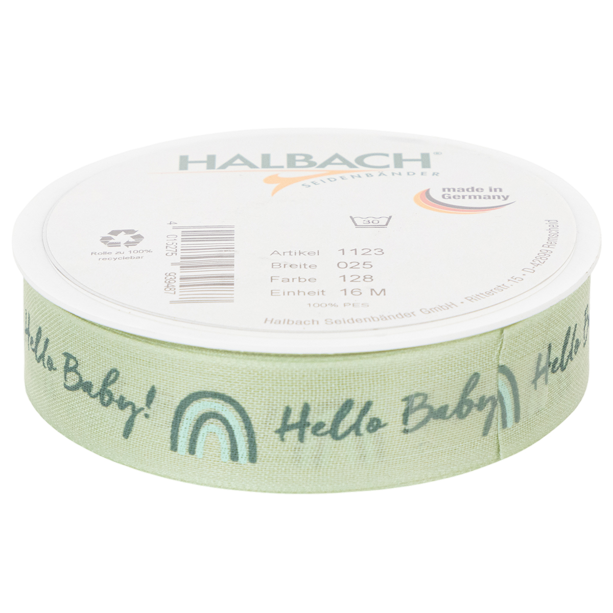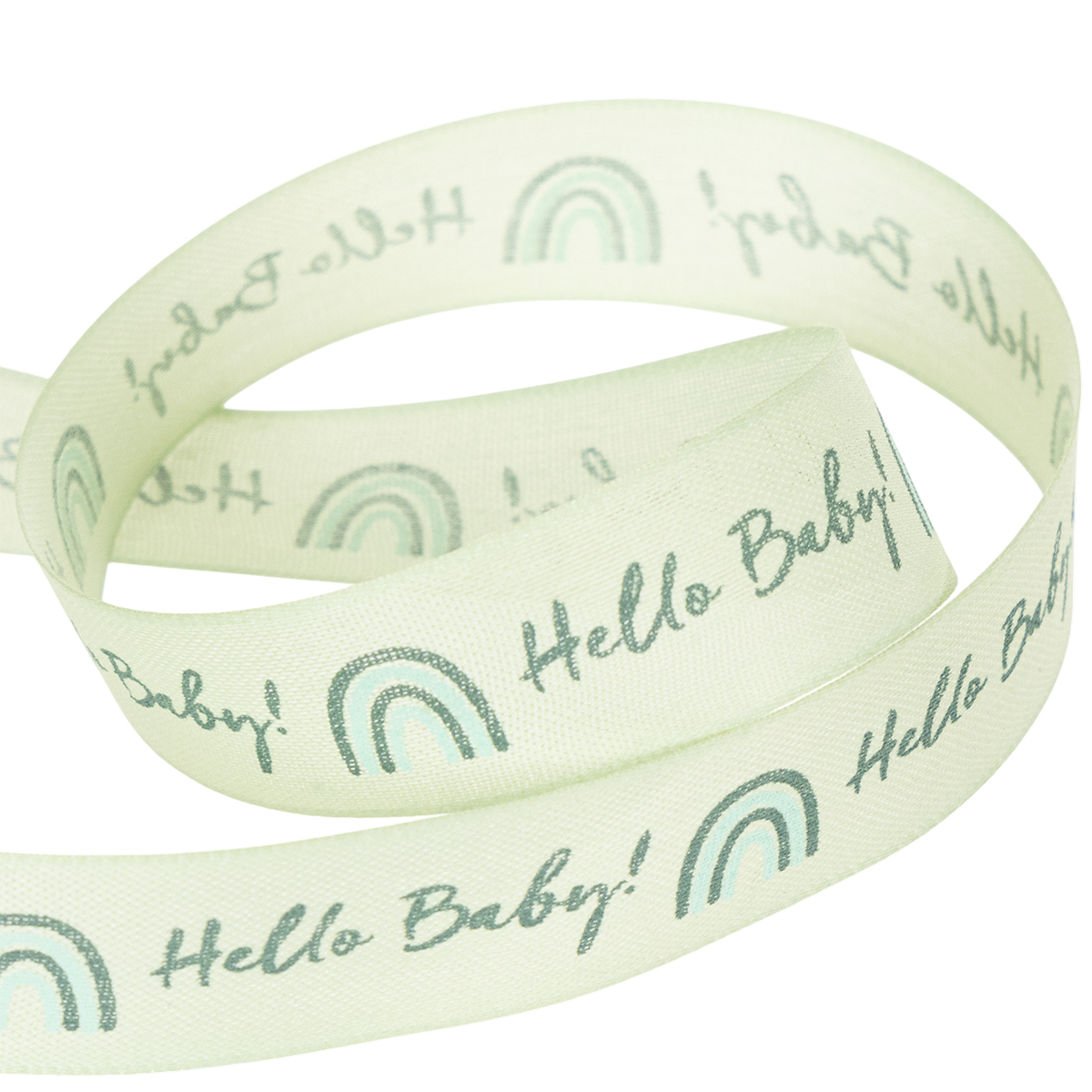"Hej baby!", presentbandet välkomnar din lilla nykomling. Det pastellgröna dekorationsbandet förkunnar de goda nyheterna med vackra bokstäver och passar för att dekorera, ge och pyssla!