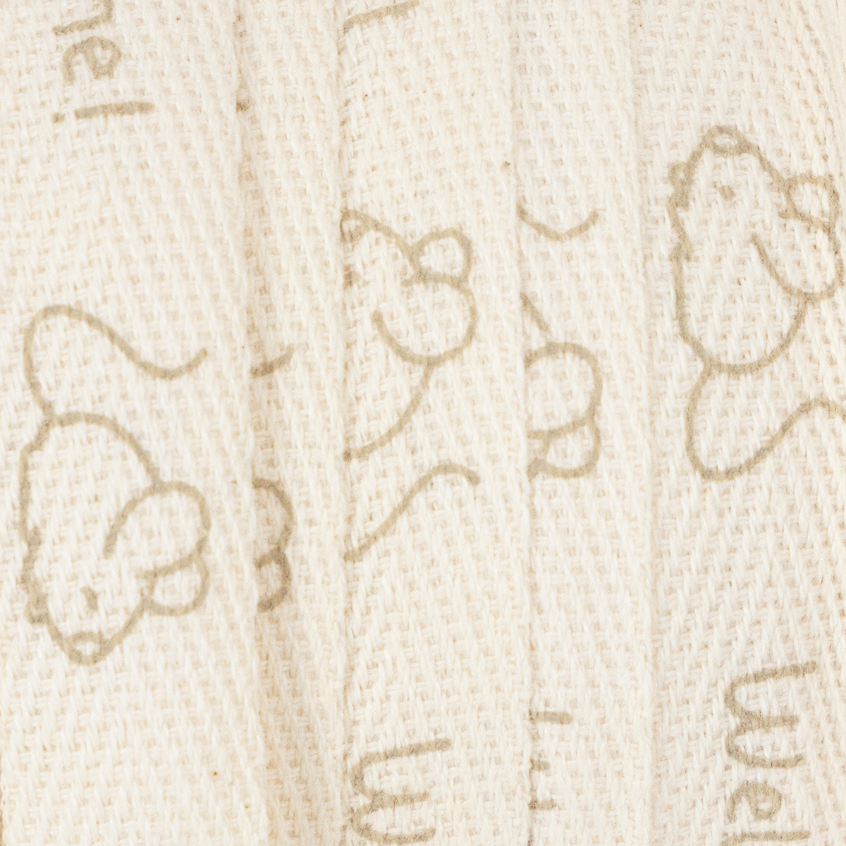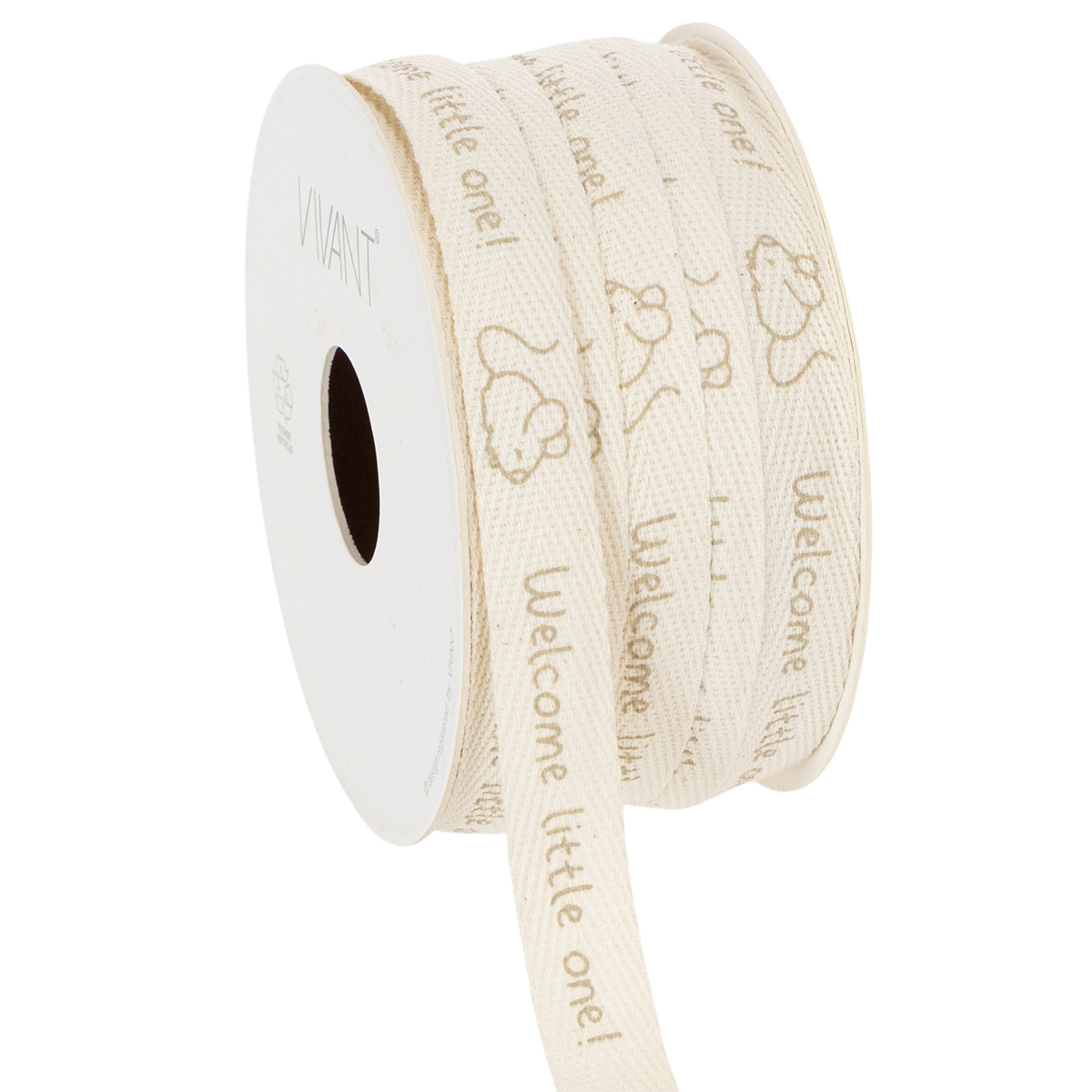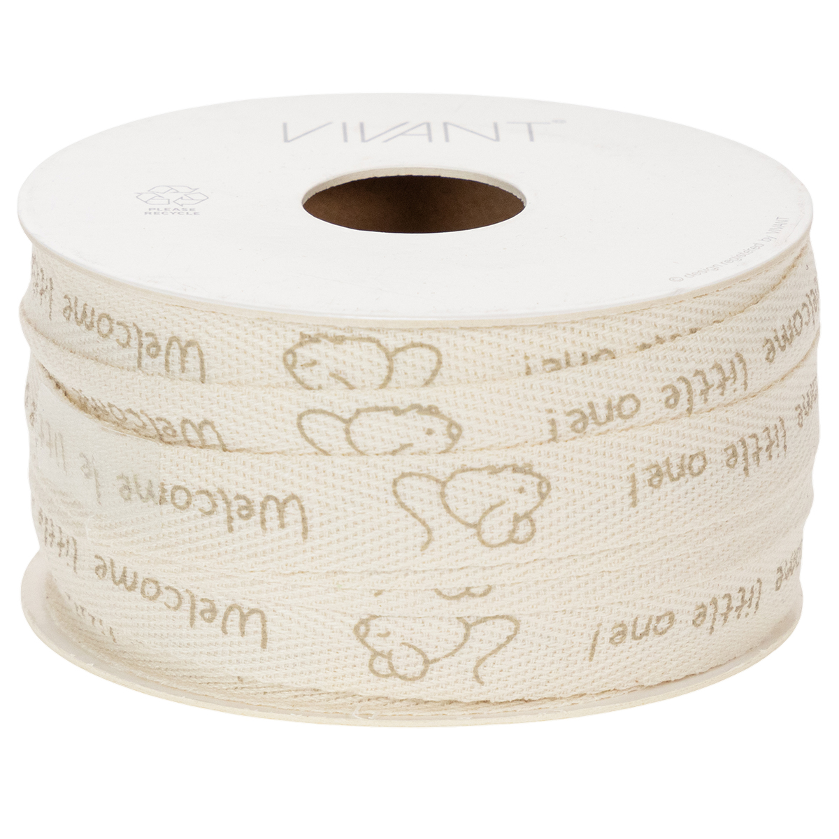 Nyfikna möss och hälsningen ”Välkommen lilla!” är tryckta i ljusbrunt på det krämfärgade bandet av ren bomull. Det dekorativa bandet tillverkat av naturmaterialet bomull är biologiskt nedbrytbart och sitter på en pappspole för mer hållbarhet. Det gör att dopdekorationen inte kräver någon plast.