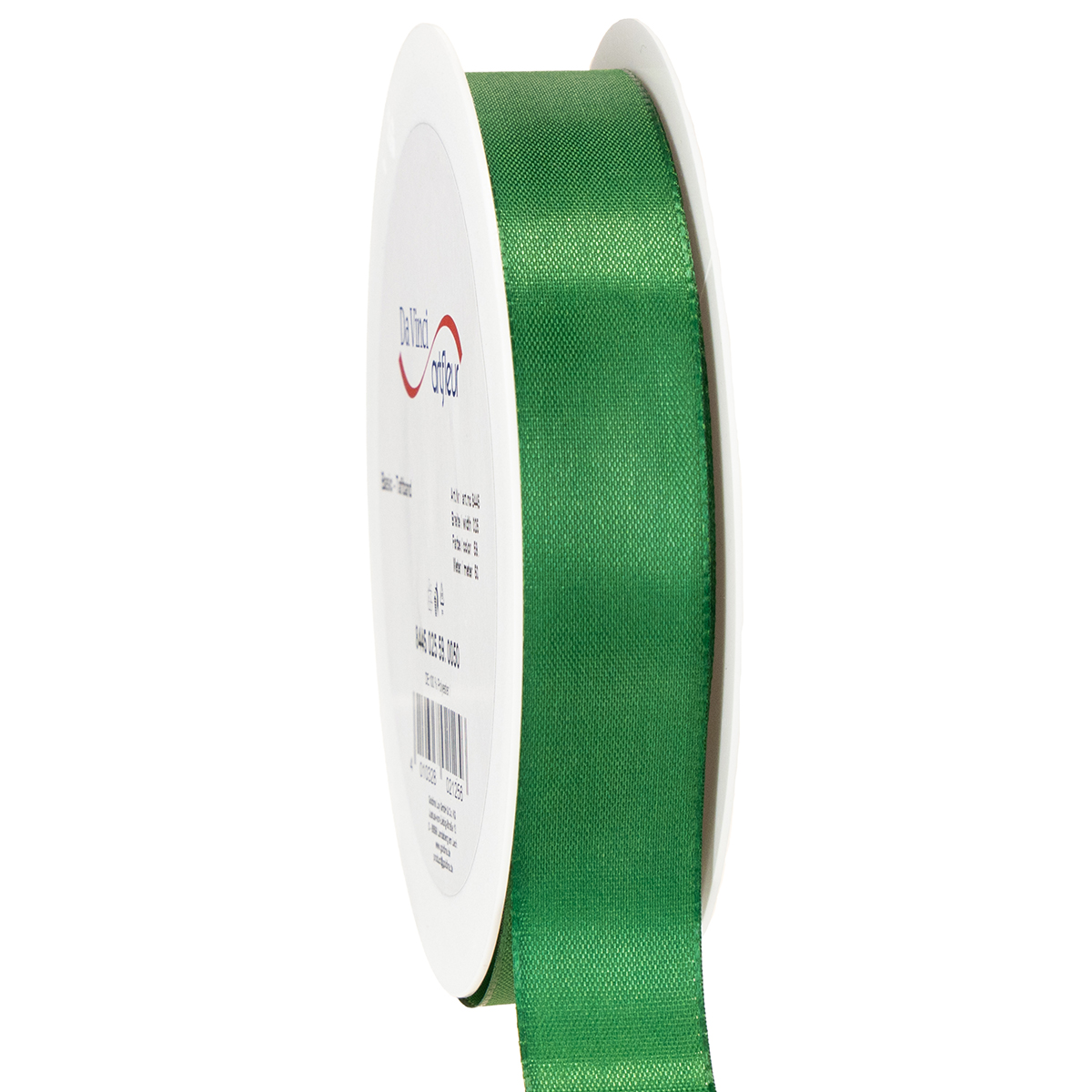 Det mörkgröna present- och dekorationsbandet är ungefär 25 millimeter brett, cirka 50 meter långt och tillverkat av 100 % polyester. Eftersom det är lindat på en praktisk plastspole kan du enkelt förvara det i en låda eller hänga det på en dispenser.
