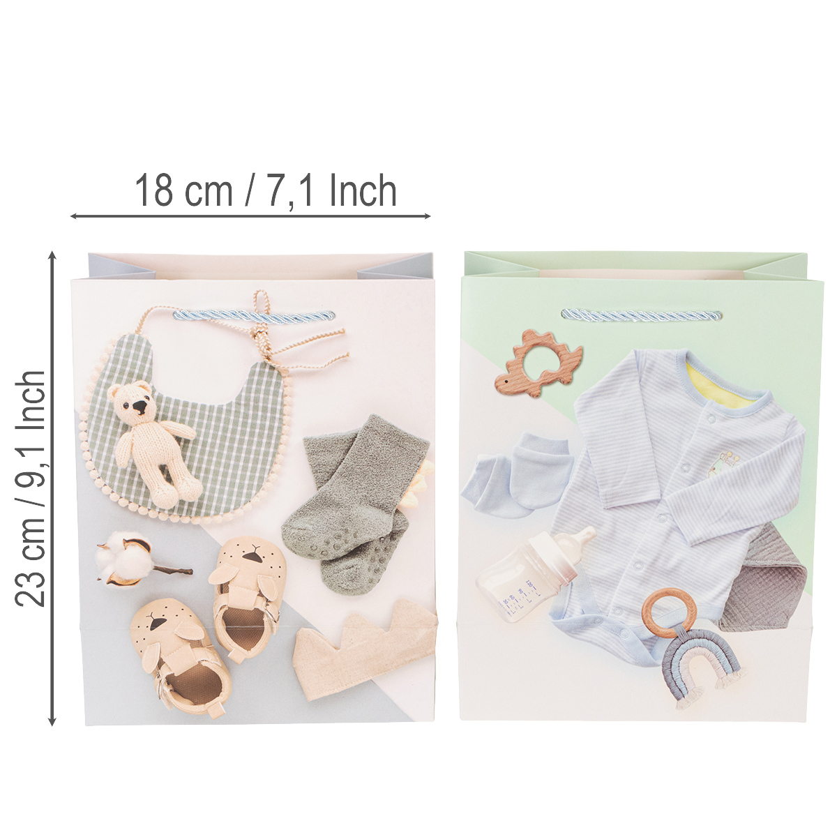 Letar du efter ett snyggt och praktiskt sätt att kärleksfullt ge bort babypresenter till en pojke? Dessa charmiga presentpåsar för pojkar, i ett praktiskt set om två, kommer att visa upp din present perfekt – oavsett om det är för en babyshower, förlossningen eller en hjärtevärmande välkomstpresent. Tillverkade av robust papper och med en längd på cirka 23 centimeter erbjuder dessa påsar gott om plats för kläder, leksaker eller andra små tecken på uppskattning. De är det perfekta valet för snygg men ändå praktisk presentinslagning.