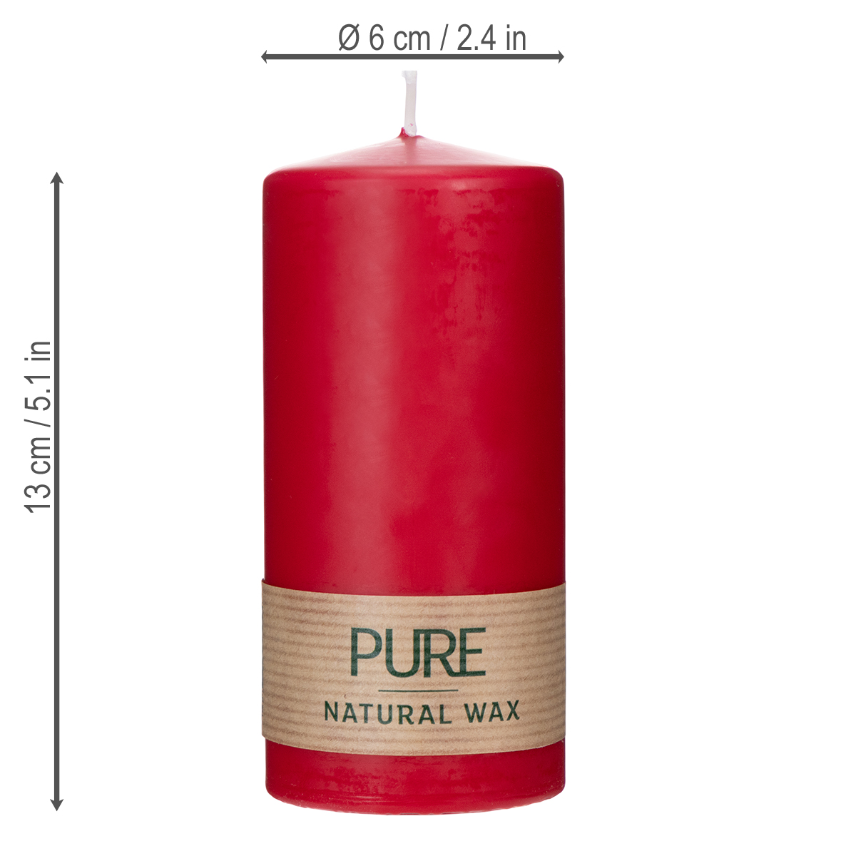 Med en höjd på 13 centimeter och en diameter på 6 centimeter är detta blockljus tillräckligt stort för att sticka ut som ett fristående föremål, men ändå hanterbart för alla inredningsstilar. Dess röda färg framkallar en känsla av värme och festlighet och kompletterar både modern och klassisk inredning. För att behålla sin livfulla färg, skydda ljuset från direkt solljus. Det är säkert att använda både inomhus och, i torrt väder, på täckta balkonger eller uteplatser.