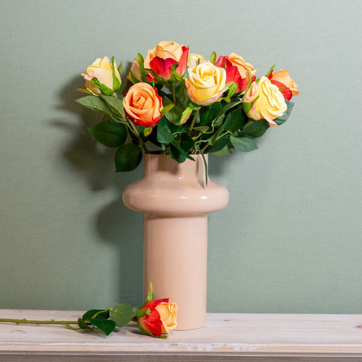 Vem har inte upplevt detta? Ett stilfullt inrett vardagsrum, en inbjudande atmosfär vid matbordet eller en elegant atmosfär på kontoret – allt med en touch av naturlighet. Men riktiga blommor vissnar snabbt, och deras skötsel kan vara tidskrävande. Med vårt rosenbukettarrangemang i strålande gult får du den perfekta kombinationen av lång livslängd och skönhet in i ditt hem. Oavsett om det är som en accent på matbordet eller en highlight på byrån, kommer dessa dekorativa konstgjorda blommor att lysa upp vilket rum som helst. Letar du efter något som är lättskött, högkvalitativt och snyggt? Då är denna konstgjorda rosenbukett det perfekta valet!