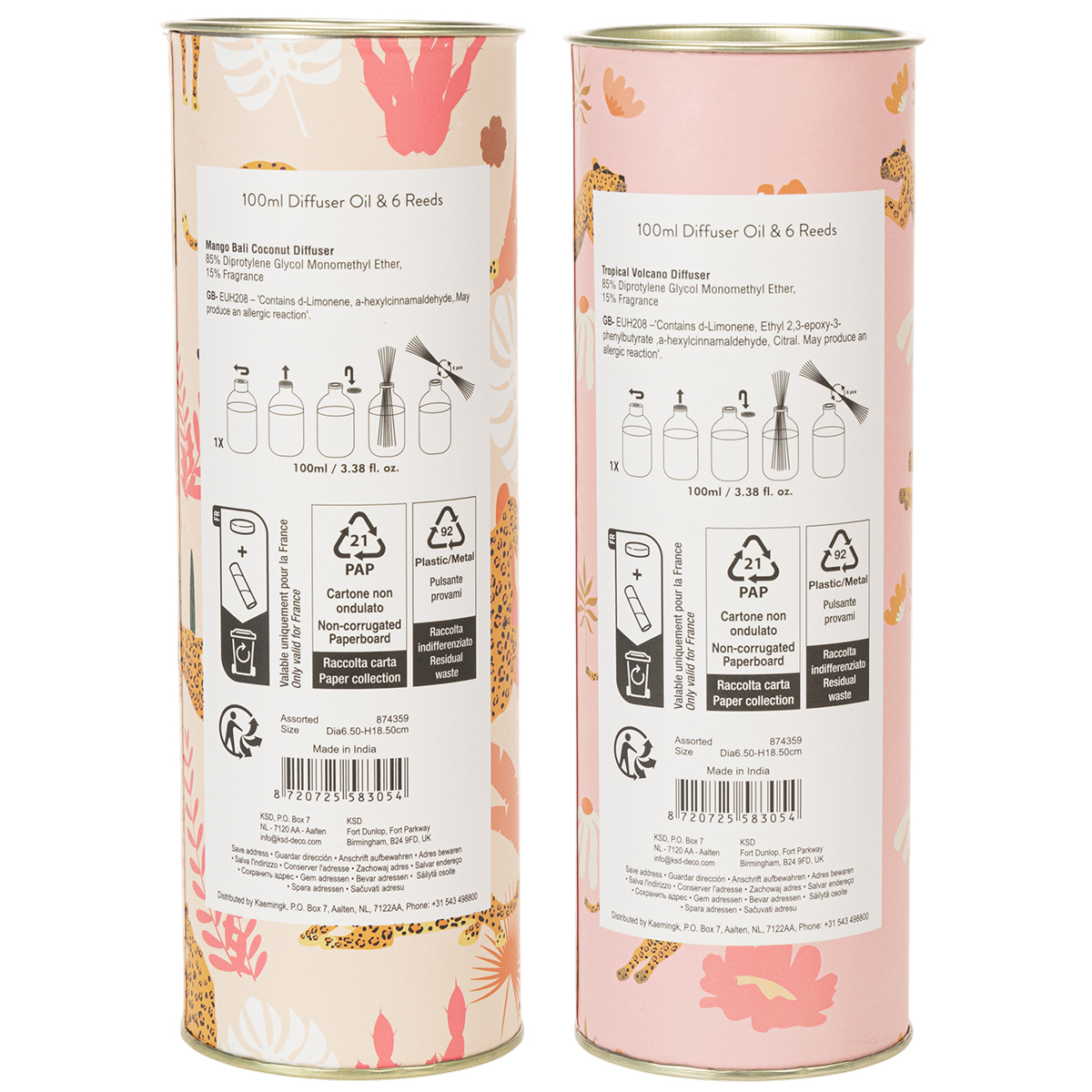 Dessa doftdiffusorer för rum släpper ut två oemotståndliga dofter: mango och kokos. Kombinationen av fruktig sötma och krämiga tropiska noter skapar en avkopplande och inbjudande atmosfär i ditt vardagsrum. Setet med två doftdiffusorer låter dig doftsätta ditt hem på en mängd olika sätt, perfekt anpassade till dina rum eller din stämning. Oavsett om den placeras på ett sidobord i vardagsrummet, används som ett dekorativt element i badrummet eller som en välkomnande doft i hallen, smälter diffusorn harmoniskt in i alla miljöer. Glasflaskorna, som mäter sex centimeter i diameter och 19 centimeter i höjd, är inte bara praktiska utan också visuellt tilltalande med sin mångfärgade design.