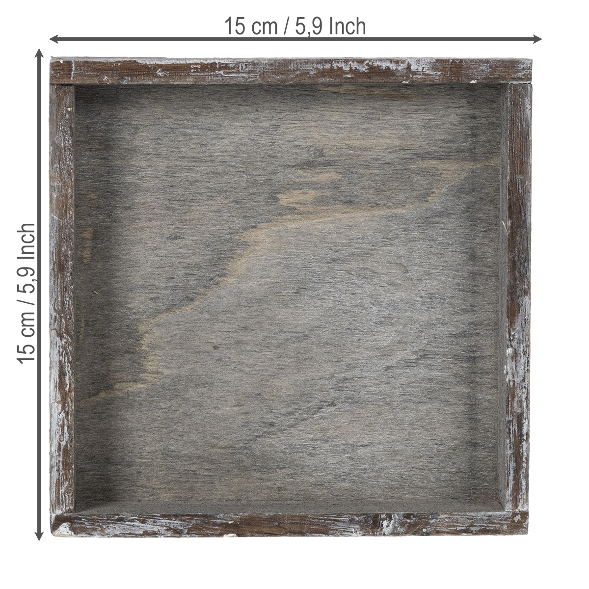 Denna fyrkantiga träbricka imponerar med sin mångsidighet och naturliga utseende. Oavsett om den är för vardagsbruk eller speciella tillfällen, hjälper denna dekorativa bricka dig att visa upp dina dekorationer med stil. Dess kompakta storlek – 15 cm lång, 15 cm bred och 3 cm hög – möjliggör perfekt placering på mindre bord eller hyllor. Dessutom är dess rustika grå träfinish helt enkelt charmig och smälter harmoniskt in i olika stilar som vintage, lantlig, bohemisk eller skandinavisk.