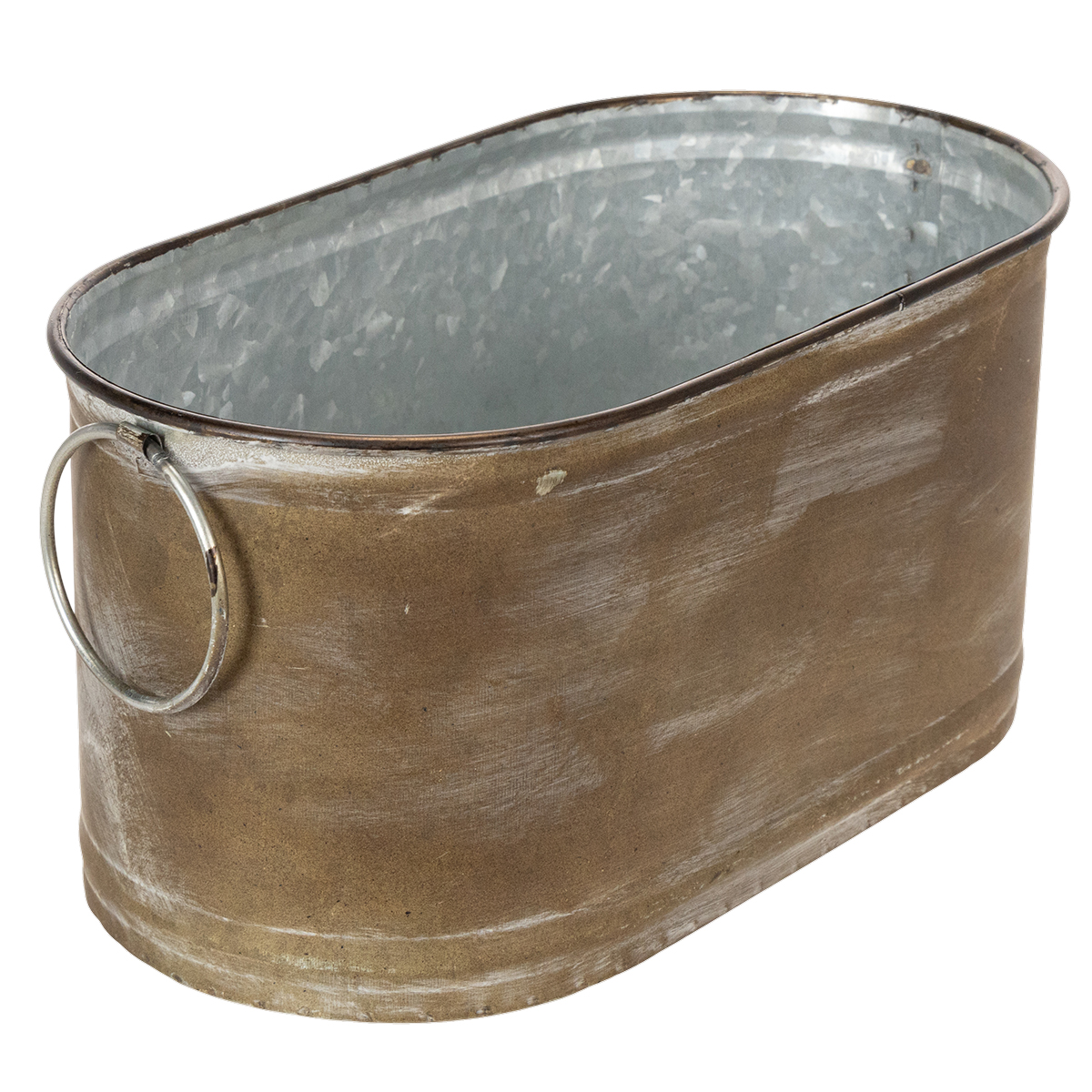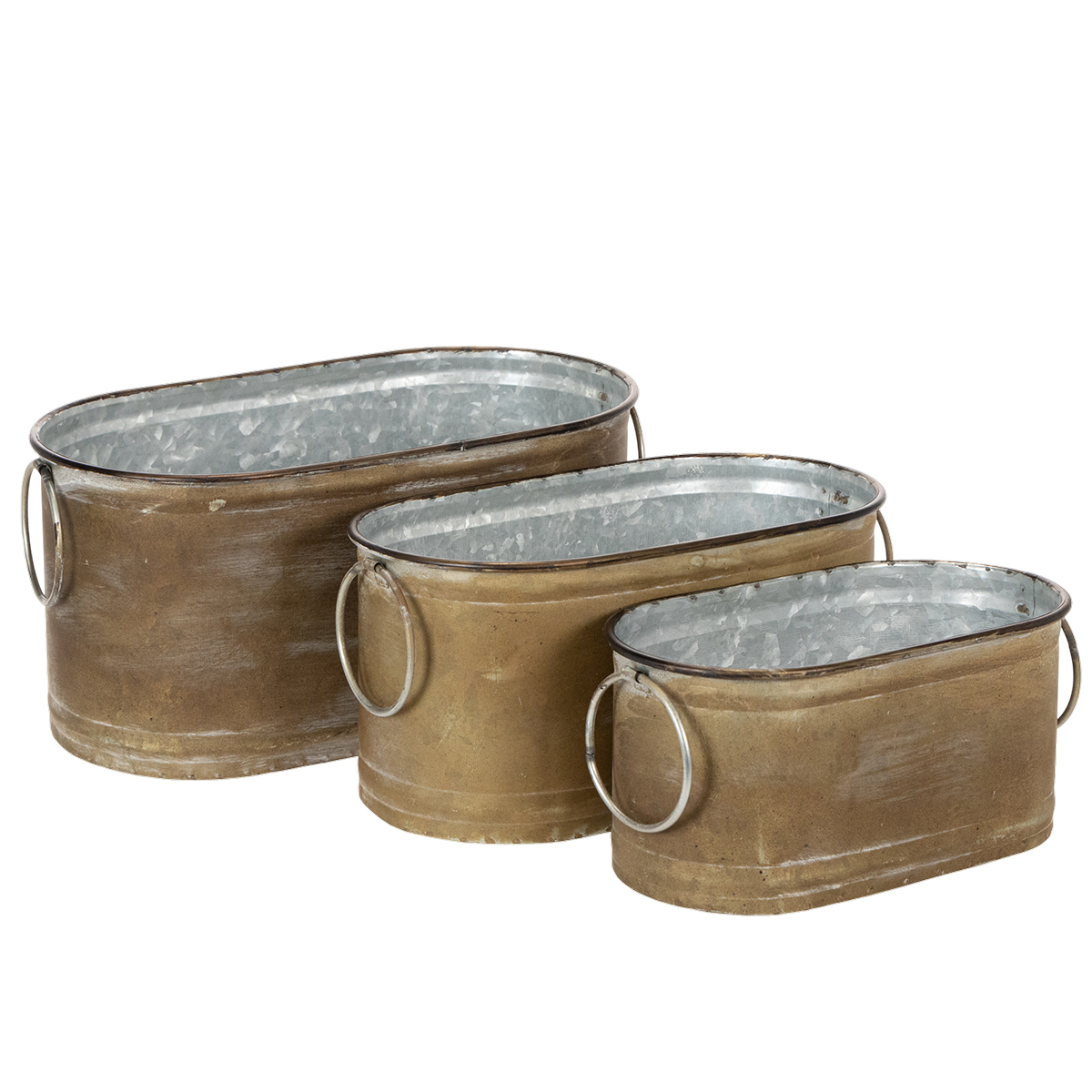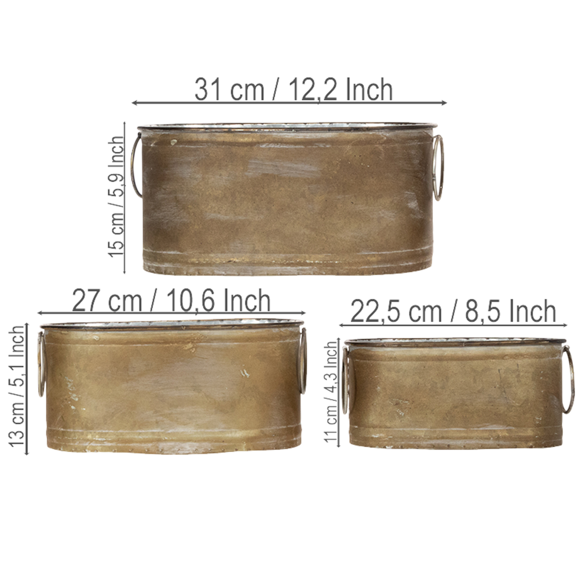 Cachepotterna i setet om 3 är formade som små baljor. Utsidan av metallbaljorna är tvättad kopparvit. Färgen och formen är retrostil, vilket gör dem lämpliga för en vintage dukning. Retrokaraktären understryks av de stora rörliga ringarna som fungerar som handtag.