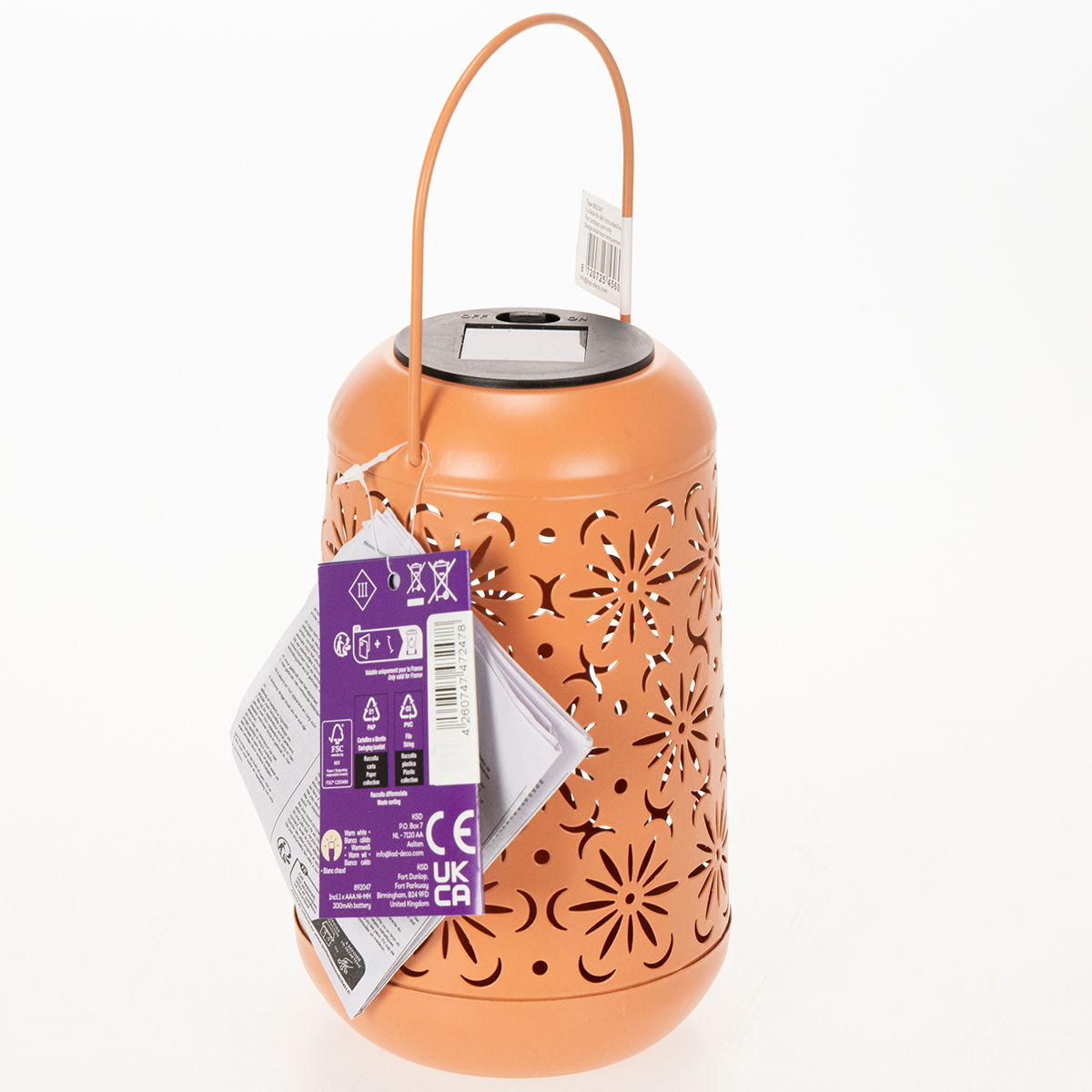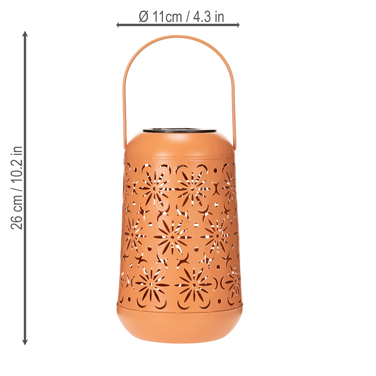 Med sitt varma ljus och blommönster skapar denna solcellslykta en inbjudande atmosfär i alla utomhusutrymmen. De delikata blommönster ger trädgården en touch av elegans och en antydan till bohemisk stil. Det högkvalitativa hantverket i en subtil orange nyans harmoniserar perfekt med både moderna och klassiska trädgårdsstilar. Oavsett om du vill skapa romantiska ljusaccenter under ljumma sommarkvällar, dekorera din uteplats med elegant belysning eller letar efter en dekorativ lösning för en trädgårdsfest – denna solcellslampa för utomhusbruk är mer än bara en ljuskälla. Den är en höjdpunkt i alla utomhusutrymmen.