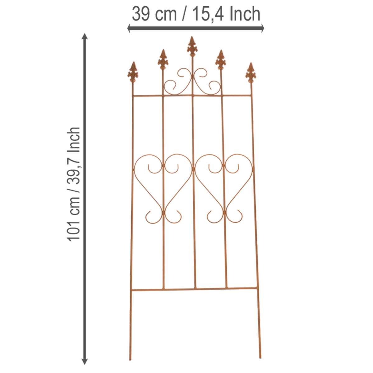 Låt din trädgård blomma! Detta spaljé, med sitt nostalgiska hjärtmotiv, utstrålar inte bara en touch av romantik utan är också mycket praktiskt. Perfekt för rosor eller som en charmig visuell rabatt i trädgården, ger detta spaljé en speciell touch till alla utomhusutrymmen. Med en höjd på 101 centimeter, en bredd på 39 centimeter och en djup på 1 centimeter är det både lätthanterligt och platsbesparande. Det bruna, väderbitna stålutseendet harmoniserar vackert med naturliga gröna toner och livfulla blomfärger. Oavsett om det är på uteplatsen, i trädgården eller som ett dekorativt tillägg till rabatter, är detta spaljé ett oumbärligt hemtillbehör för alla naturälskare.