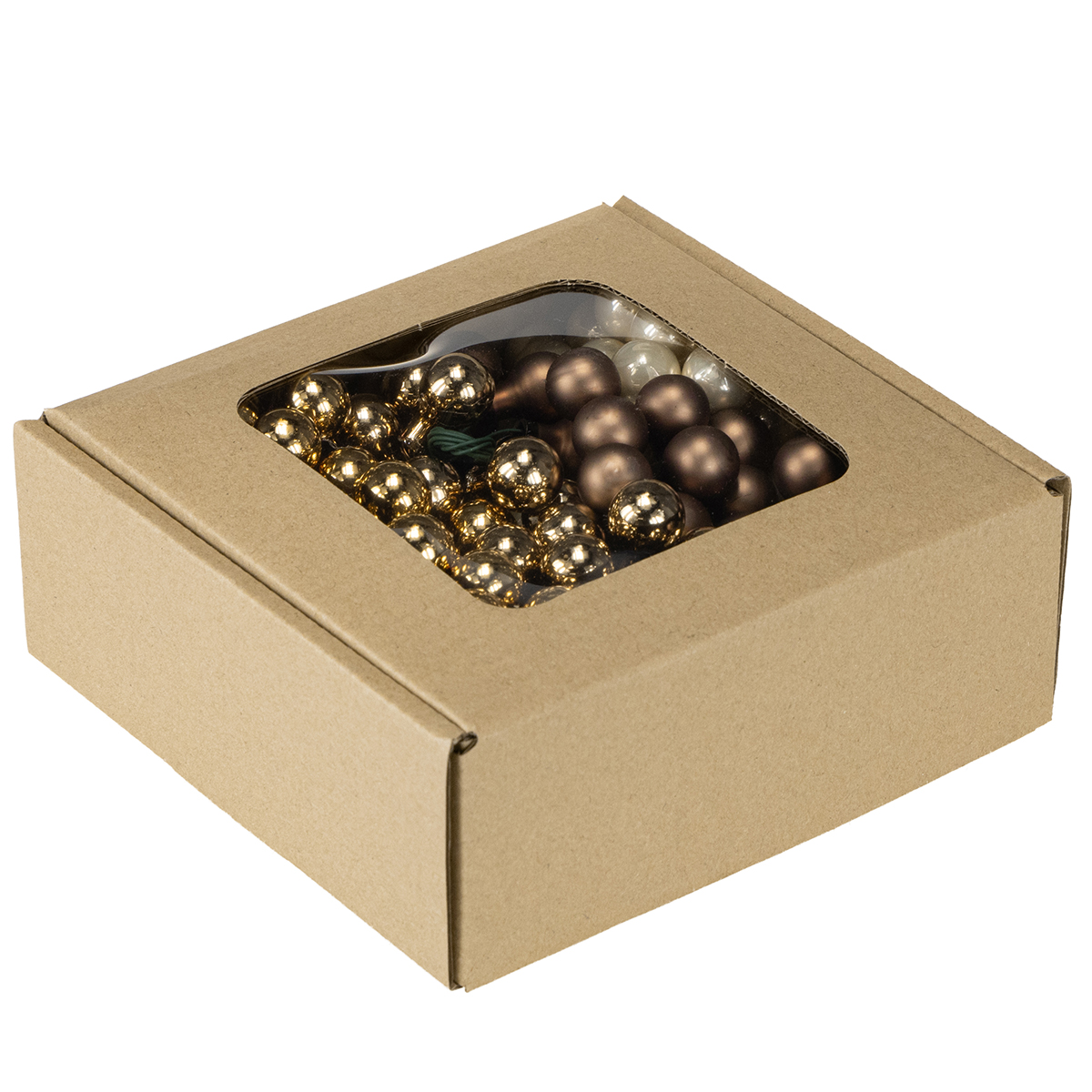 Spegelbären i brunguld finns i en uppsättning av 140 stycken med totalt 4 olika färger i lika delar: gammalt guld, vitt och grönbrunt i glansigt och rådjur i matt. De små glashuvuden har alla en diameter på ungefär 1,5 centimeter och inklusive grön hantverkstråd, en storlek på cirka 15 centimeter.
