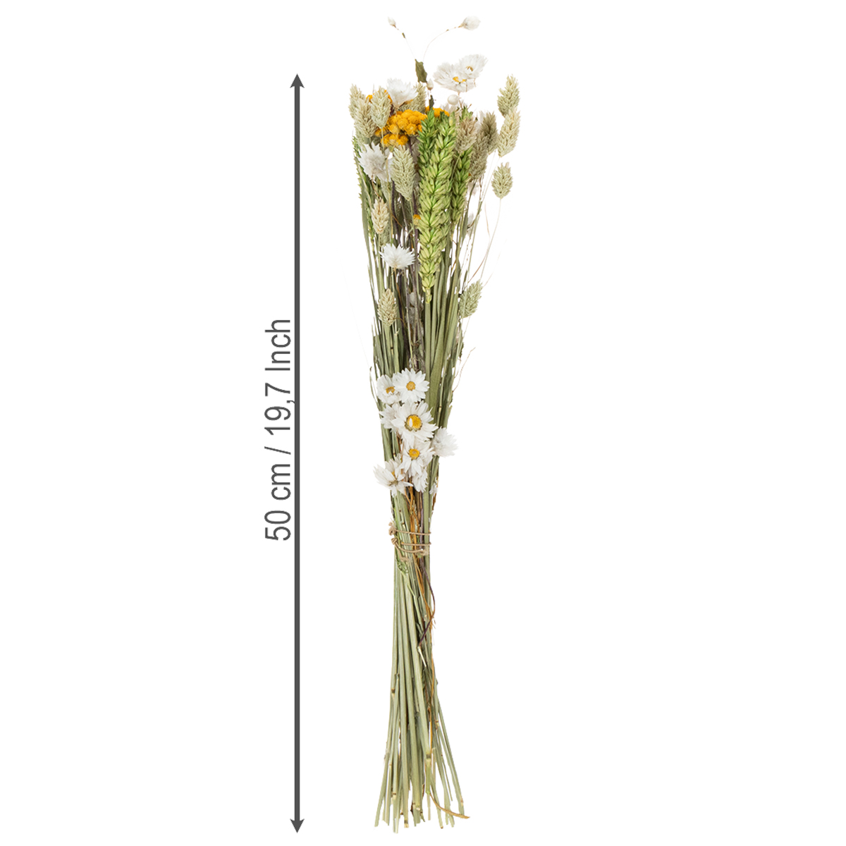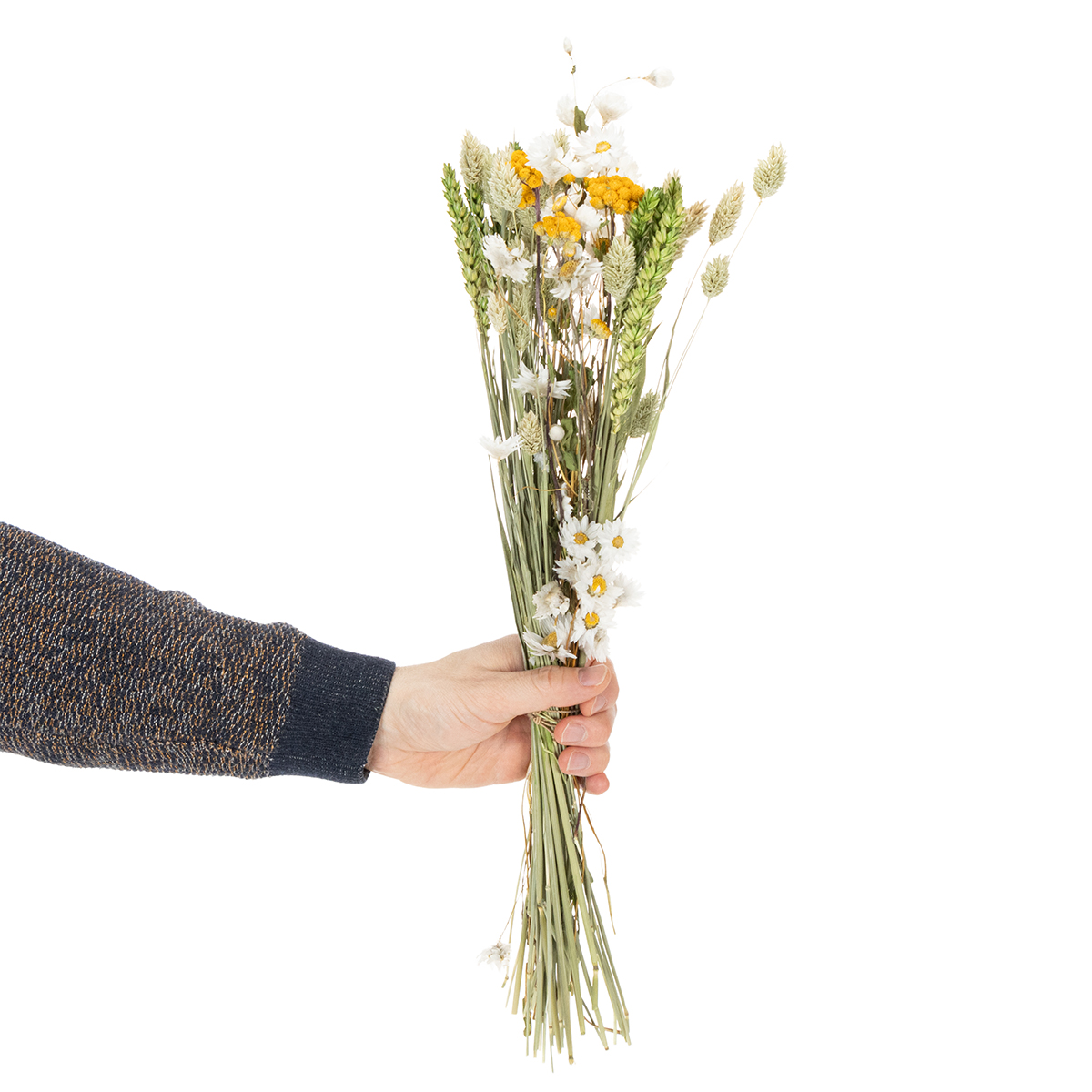 Tack vare sina naturliga, hållbara material är denna bukett lätt att sköta och behåller sina livfulla färger i åratal. En mild pudring räcker för att bevara dess skönhet. Den är också ett underbart alternativ till färska blommor, eftersom den varken kräver vatten eller särskild skötsel. Upplev torkade blomsterdekorationer när de är som bäst!