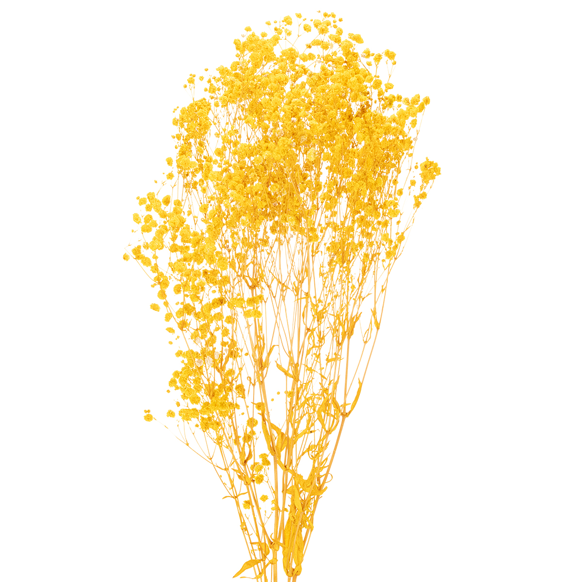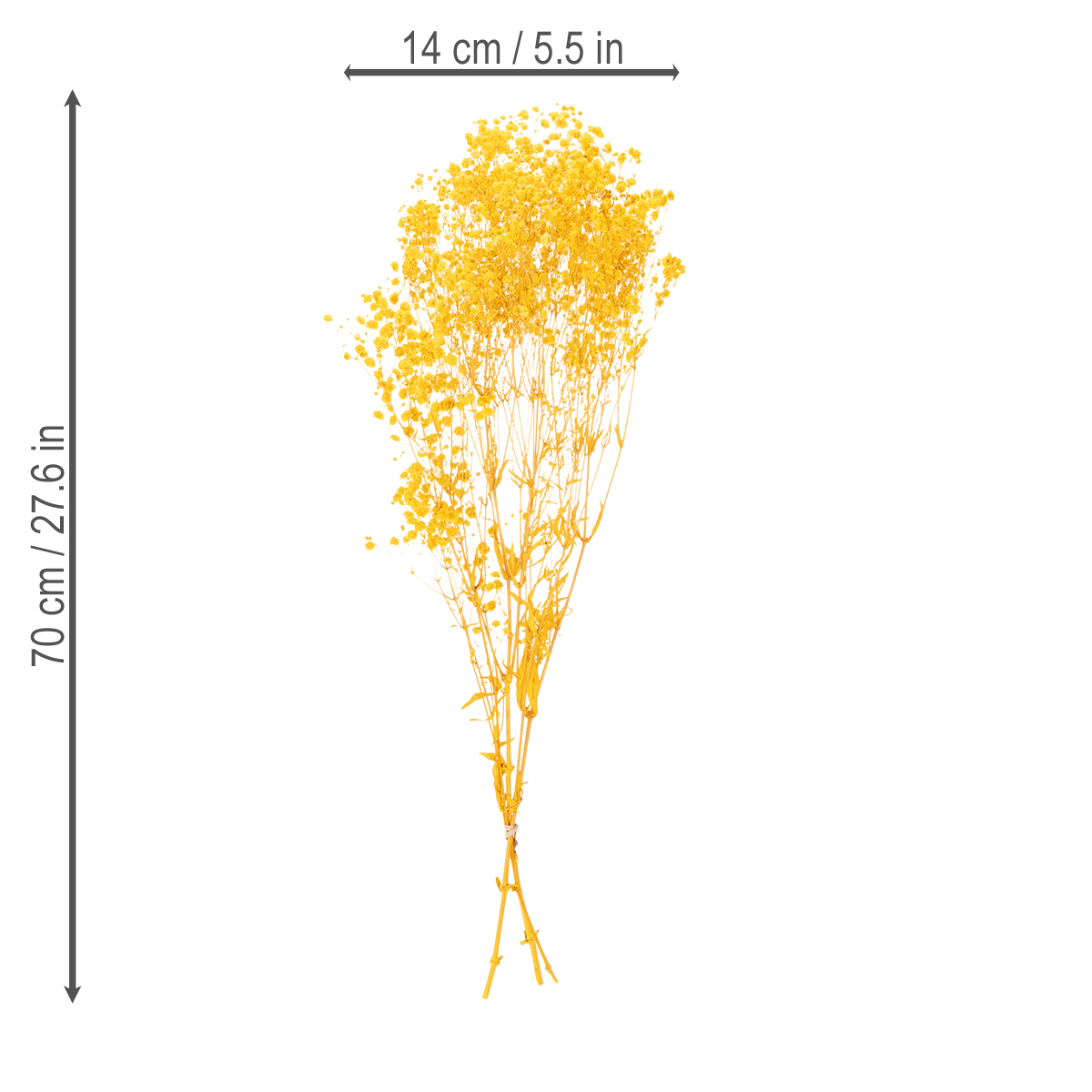Baby's breath symboliserar lätthet och elegans, och i denna bukett tillför den en glad touch av varm gul. Tillverkad av riktiga, omsorgsfullt torkade blommor, är denna bukett perfekt för inomhus- eller skyddade utomhusutrymmen.