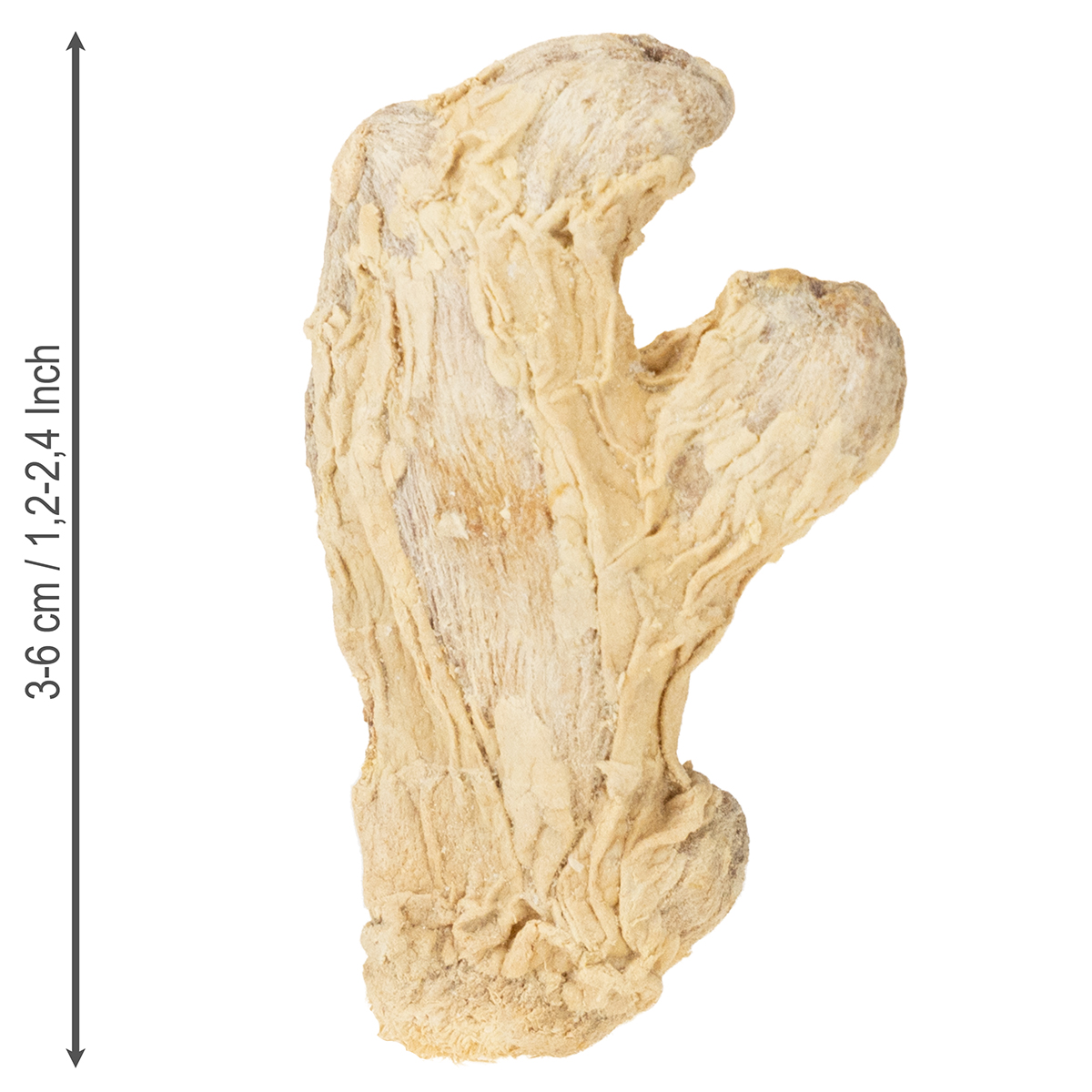 Den torkade ingefäran levereras i en påse med 500 gram. Storleken på de enskilda bitarna varierar och kan vara mellan 3 och 6 centimeter.