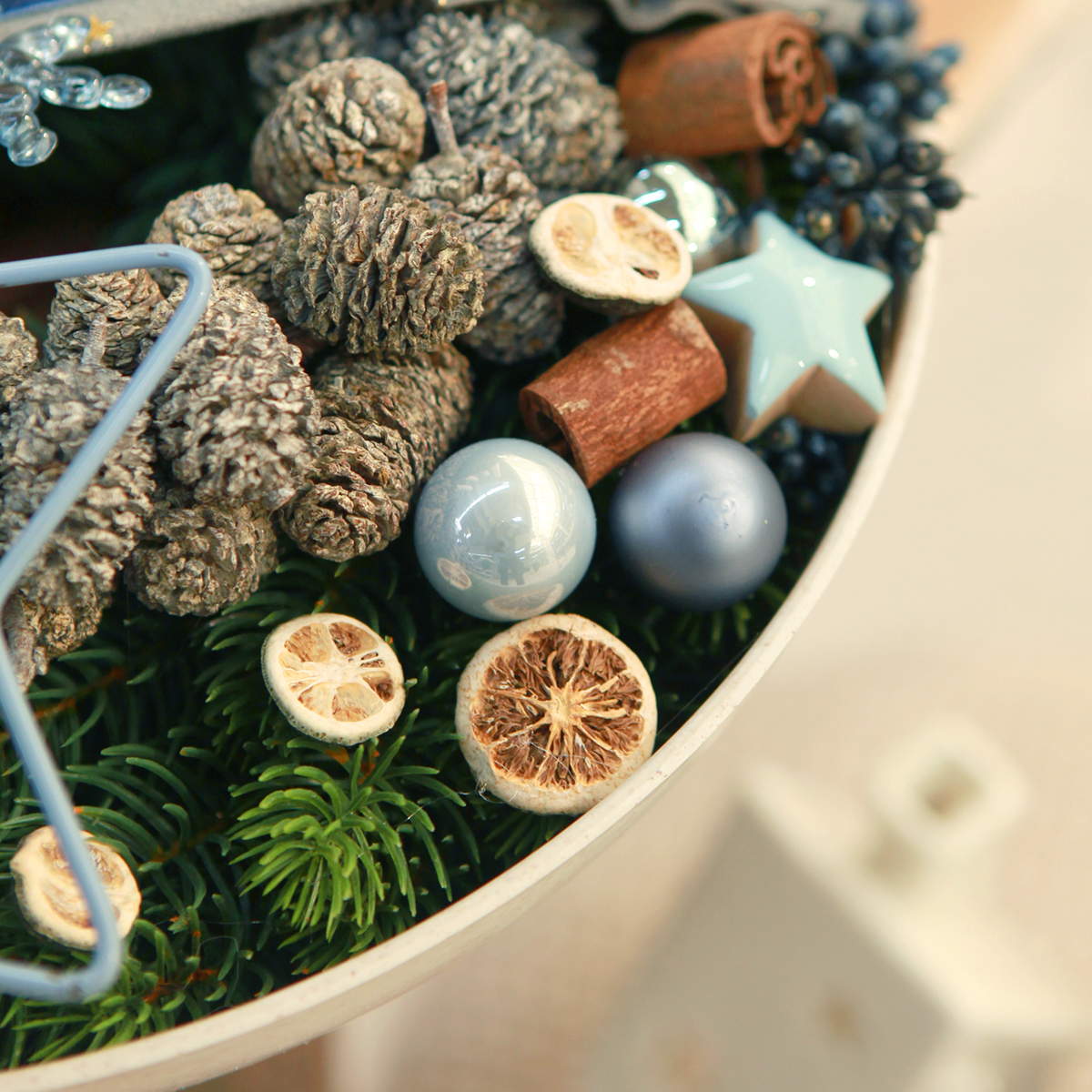 Material: Naturmaterial som kottar, trä, bark, mossa, kvistar, löv, torkade blommor, tång och kokosfibrer.