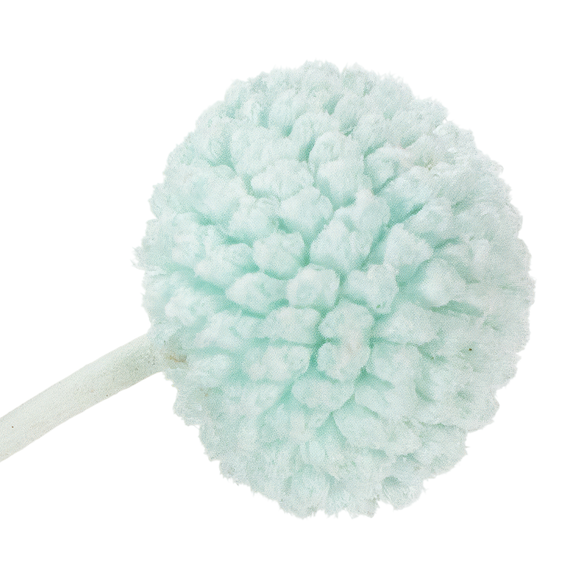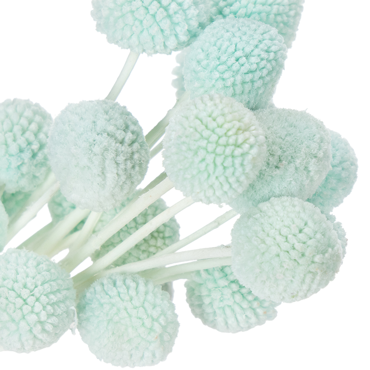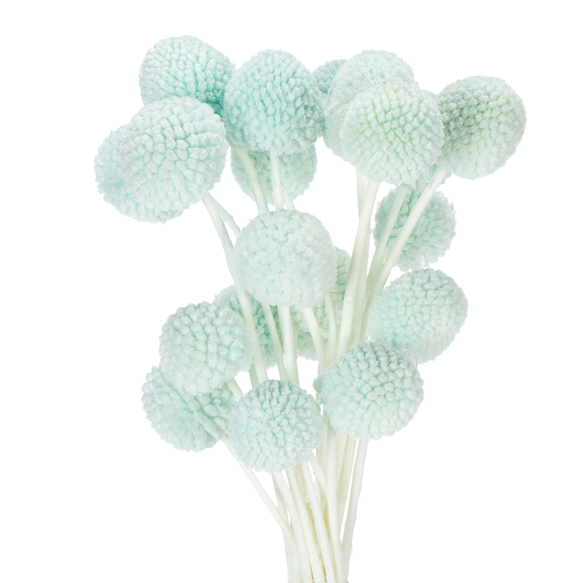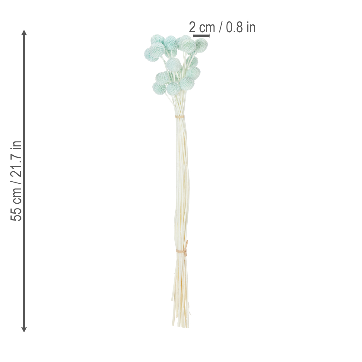 Craspedia-blommornas huvuden har en diameter på cirka två till tre centimeter, vilket gör buketten till ett attraktivt mittpunkt. De naturfärgade stjälkarna skapar en charmig kontrast till den livfulla mintblå färgen. Buketten ser särskilt dekorativ ut i minimalistiska vaser eller som ett komplement till ett större arrangemang med andra torkade blommor. Kombinera den till exempel med pampasgräs eller eukalyptus för en luftig, modern look.