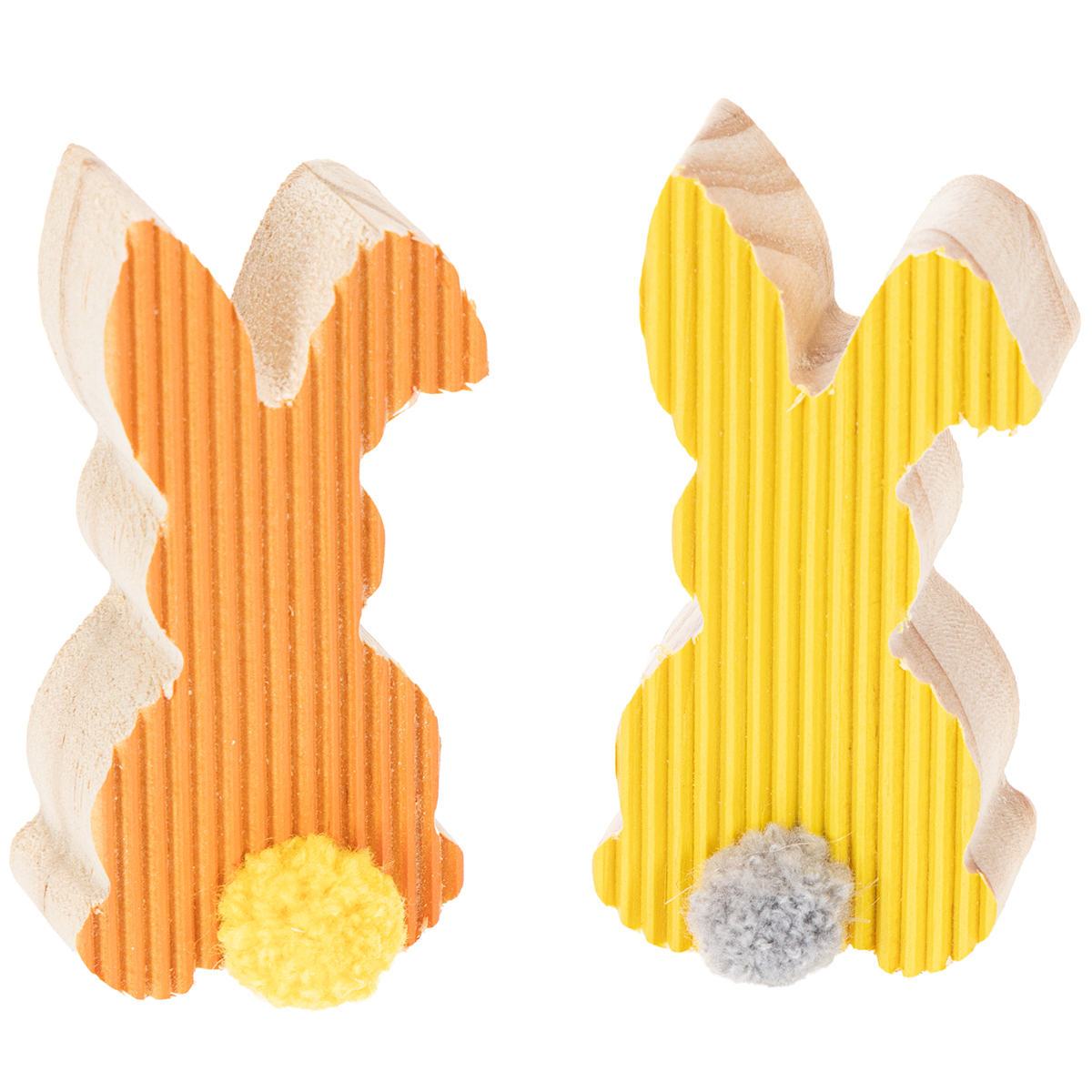 De frästa spåren skapar en attraktiv optisk illusion: de dekorativa kaninerna ser tvåfärgade ut. Bara svansen på trädekorationen har en annan färg! De små påskhararna till bordsdekorationerna är gjorda av massivt äkta trä. Ryggen och trädekorationen är helt obehandlade.