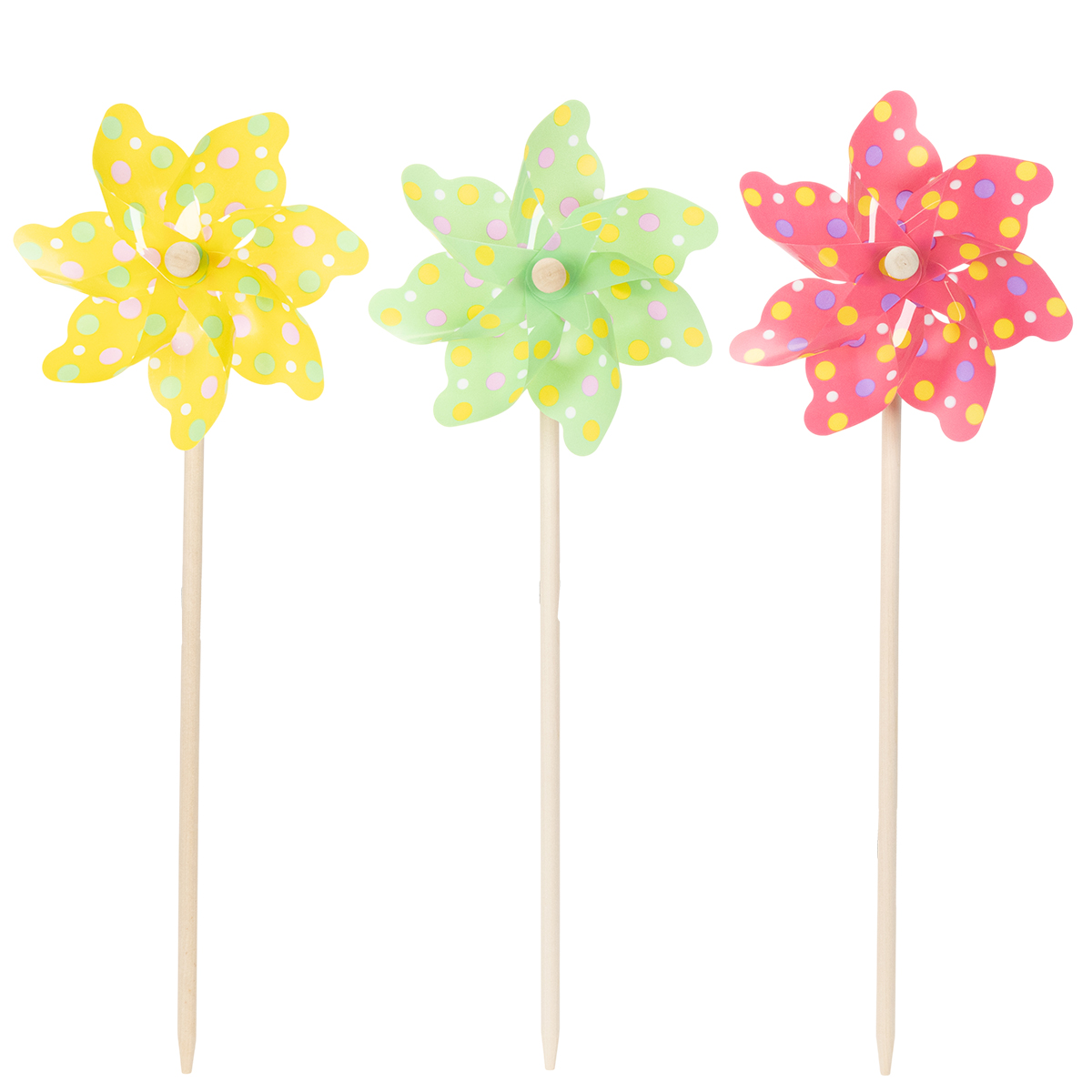Med en totalhöjd på 47 cm och en diameter på 17 cm är dessa väderkvarnar perfekt proportionerade för placering bland blommor och växter. Det robusta plastmaterialet i kombination med en robust träpåle garanterar hållbarhet. Och bäst av allt: du får ett set om tre, så att du kan låta din kreativitet flöda fritt.