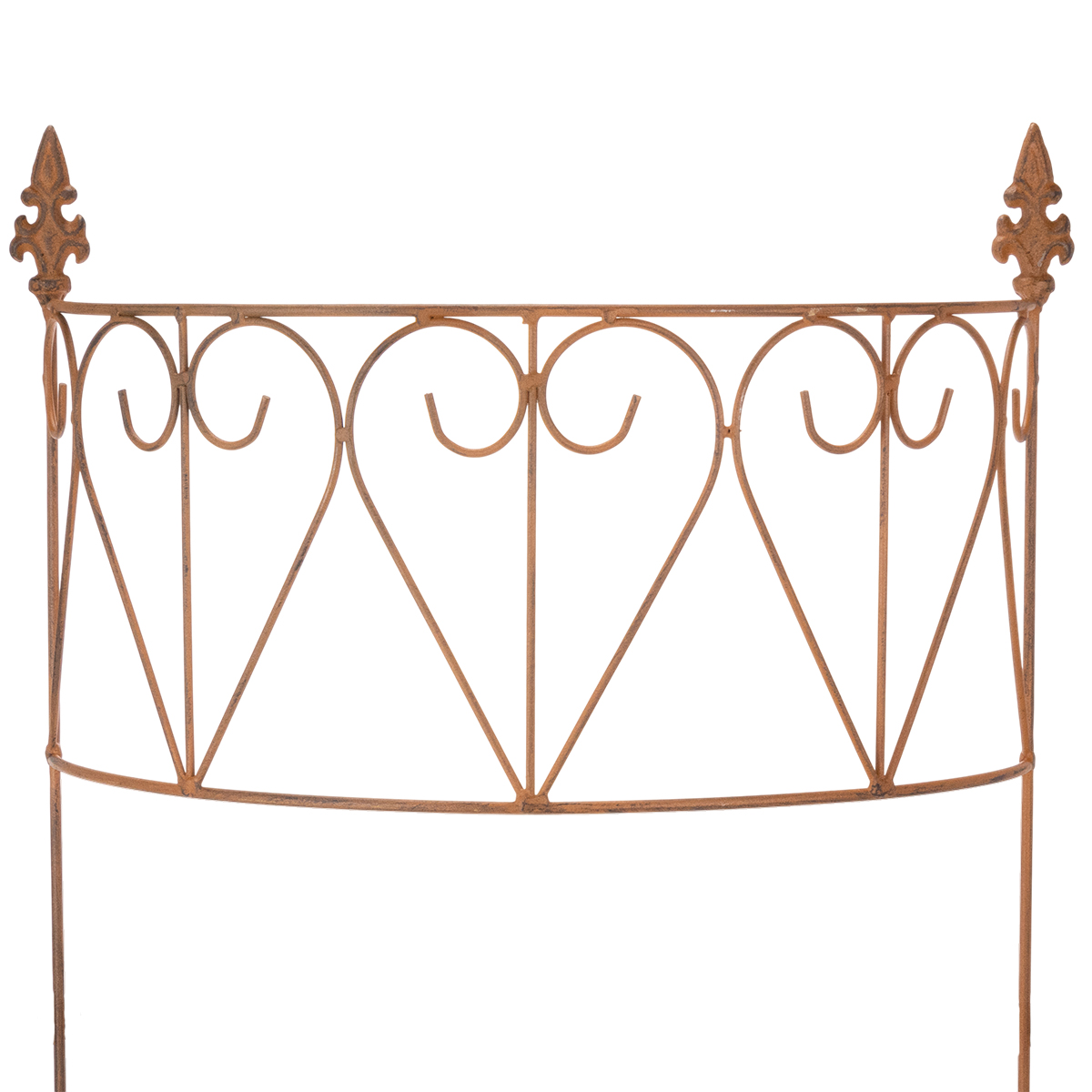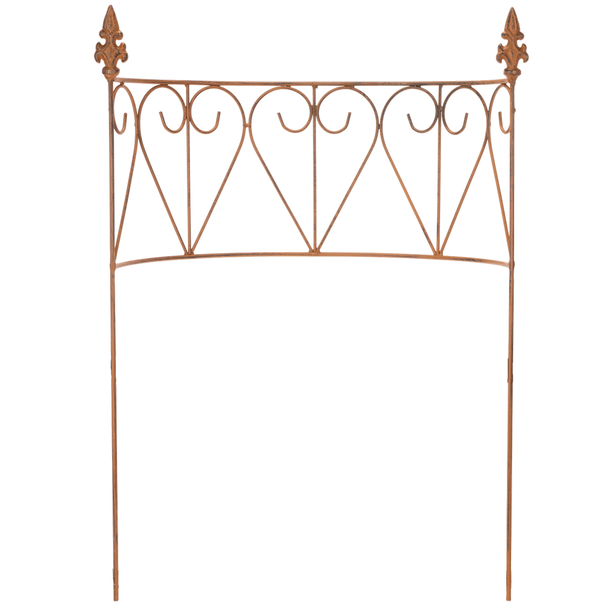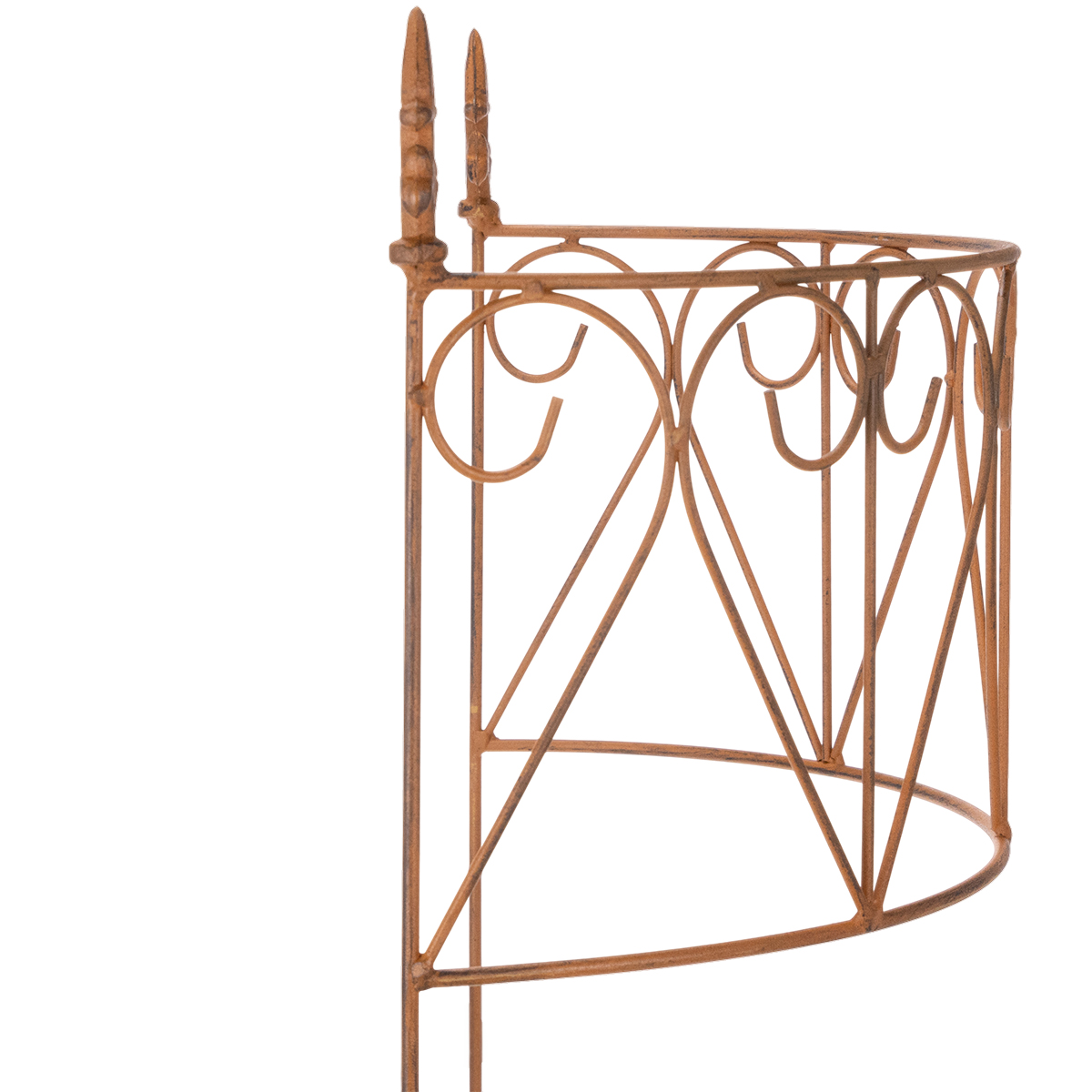 Detta trädgårdsspaljé i metall imponerar med sin harmoniska, lekfulla design och högkvalitativa hantverk. Tack vare sin varma, bruna, väderbitna rostfärgade finish blir den snabbt ett iögonfallande inslag i vilken trädgård som helst. Idealisk för klätterväxter, ger den inte bara stöd utan bringar också struktur och ordning till din rabatt. Växter som murgröna, krasse eller klätterrosor finner ett säkert stöd på de robusta metallstöttorna och trivs optimalt.