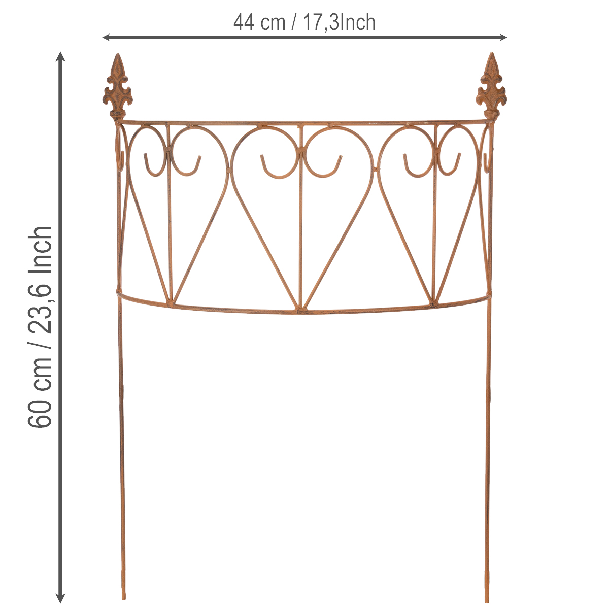 Älskar du att kreativt designa din trädgård? Med detta metallspaljé för dina rabatter lägger du inte bara till dekorativa accenter utan stöder även dina växters tillväxt. Trädgårdspåkens eleganta design i varmbrunt harmoniserar perfekt med alla trädgårdsstilar, medan det väderbeständiga materialet lovar långvarig njutning. Oavsett om den används som ett snyggt spaljé eller ett elegant dekorativt element, ger denna metallspaljé funktionalitet och estetik till din rabatt. Med en höjd på 60 centimeter erbjuder den optimalt stöd för klätterväxter som rosor, klematis eller luktärtor och har en charmig, väderbiten rostfinish.