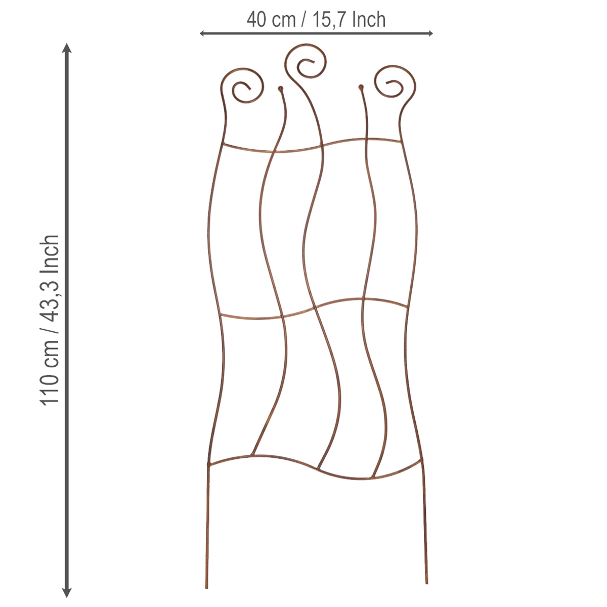 Detta dekorativa spaljé i metall är ett underbart tillskott till vilken trädgård som helst. Dess böljande linjer ger det en elegant känsla som smälter perfekt in i naturliga, romantiska eller moderna trädgårdsdesigner. Tack vare sin robusta konstruktion ger spaljén inte bara ett stabilt stöd utan fungerar även som ett dekorativt element – oavsett om det är en avdelare mellan trädgårdsområden eller som ett iögonfallande element längs gångar och rabatter. Den väderbitna stålpatinan skapar ett sofistikerat utseende som harmoniserar vackert med vilken miljö som helst. Och bäst av allt: spaljén är otroligt lätt att rengöra. En fuktig trasa räcker för att ta bort smuts och väderrester.