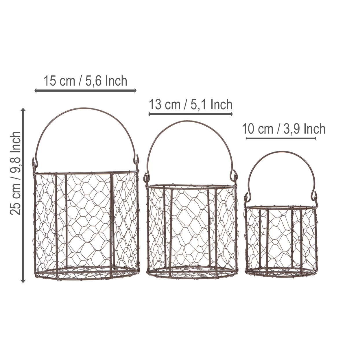 Denna uppsättning med tre trådkorgar är en vinnare rakt igenom. Tillverkade av robust metall och exceptionellt hållbara tack vare sitt fina nät, är de det perfekta tillskottet till alla moderna hem. Med en diameter på 15 cm (stor korg) och en höjd på 25 cm kan de rymma praktiskt taget allt du vill hålla organiserat. Frukt och grönsaker? Inga problem. Köksredskap eller tygservetter? Perfekt. Eller kanske du föredrar en dekorativ touch? Växtarrangemang och blommor utvecklar sin speciella charm i dessa korgar. Tack vare sin runda form och robusta bärhandtag kan korgarna enkelt flyttas från rum till rum eller ut i trädgården. Alla som älskar vintagestil kommer att bli omedelbart fängslade. Den bruna färgen säkerställer att uppsättningen smälter harmoniskt in i alla inredningar – från skandinavisk minimalism till rustik lantlig stil. Korgarna ser särskilt bra ut i kombination med andra dekorativa element gjorda av naturmaterial. Varför inte prova dem?