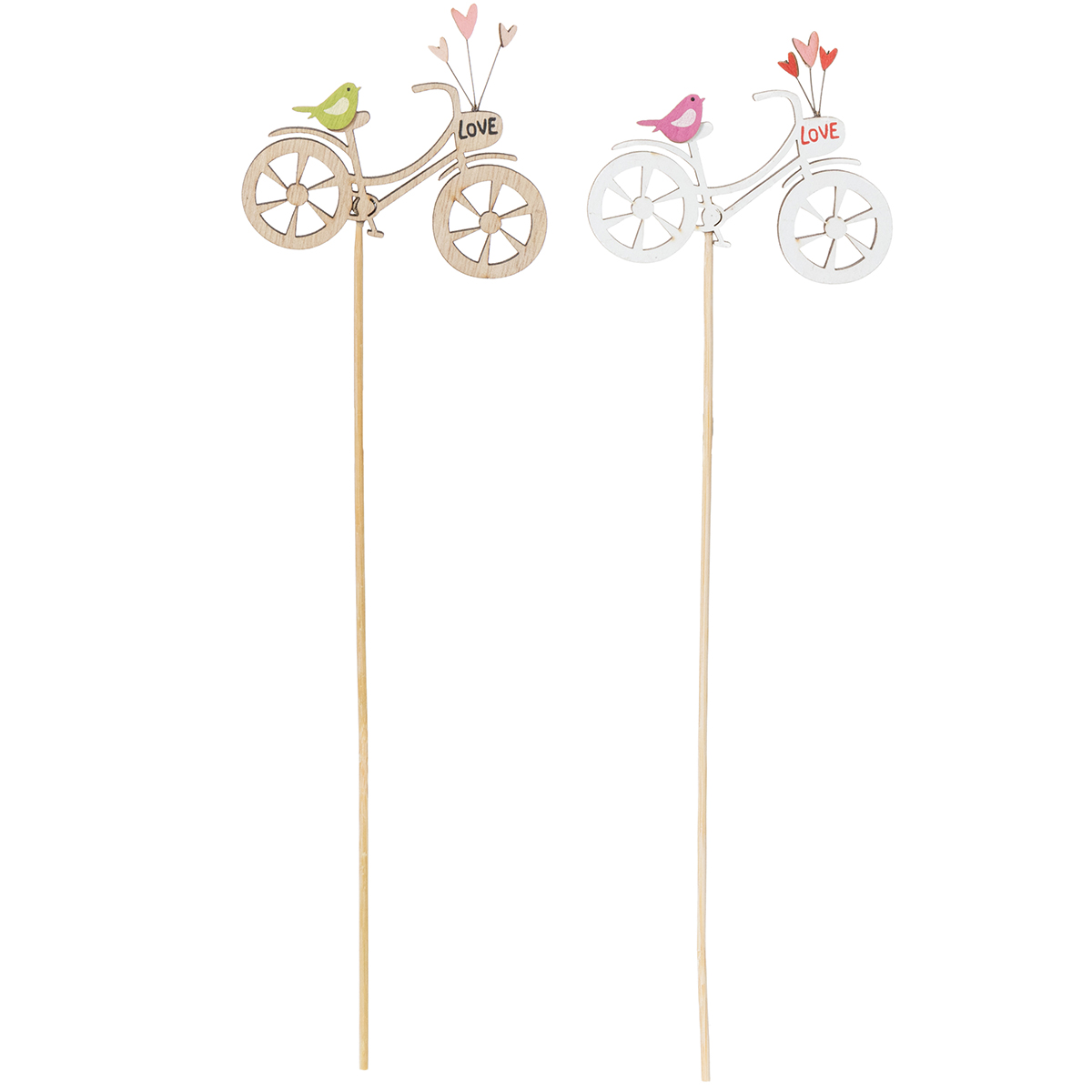 Letar du efter en speciell dekoration för att få in våren i ditt hem? Dessa träpåkar med cykelmotiv är precis vad du behöver för att ge en romantisk touch till ditt vardagsrum, balkong eller uteplats. Med fina detaljer som en naturfärgad träcykel, små hjärtan och charmiga små fåglar kommer denna dekoration garanterat att fånga allas blickar. Vad sägs om ett kreativt arrangemang i en fräsch vårbukett eller som en höjdpunkt i en kruka? Pålarnas naturliga utseende passar perfekt till lantlig inredning eller moderna blomsterarrangemang.