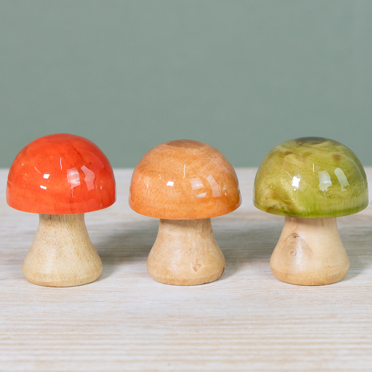 Har du någonsin undrat hur du kan ge ditt vardagsrum eller matbord den där underbara höstliga charmen? Ibland räcker en liten, kärleksfullt utvald dekoration för att frammana en atmosfär full av värme och komfort. Våra träsvampar i grönt, rött och orange ger just det: ren höstkänsla! Med sin behändiga storlek på 6,5 cm och sin robusta träkonstruktion passar svamparna inte bara perfekt in i alla arrangemang utan utstrålar också en touch av rustik lantlig stil. Oavsett om de är som en del av din bordsdekoration, på fönsterbrädan eller i en höstkrans – dessa träfigurer är så mångsidiga att de garanterat kommer att bli höjdpunkten i din inredning.