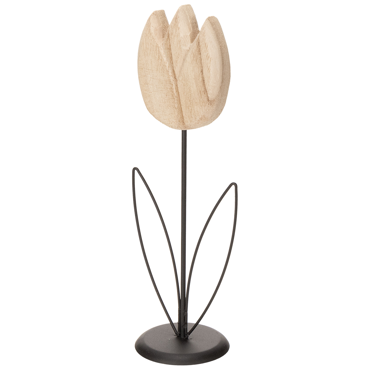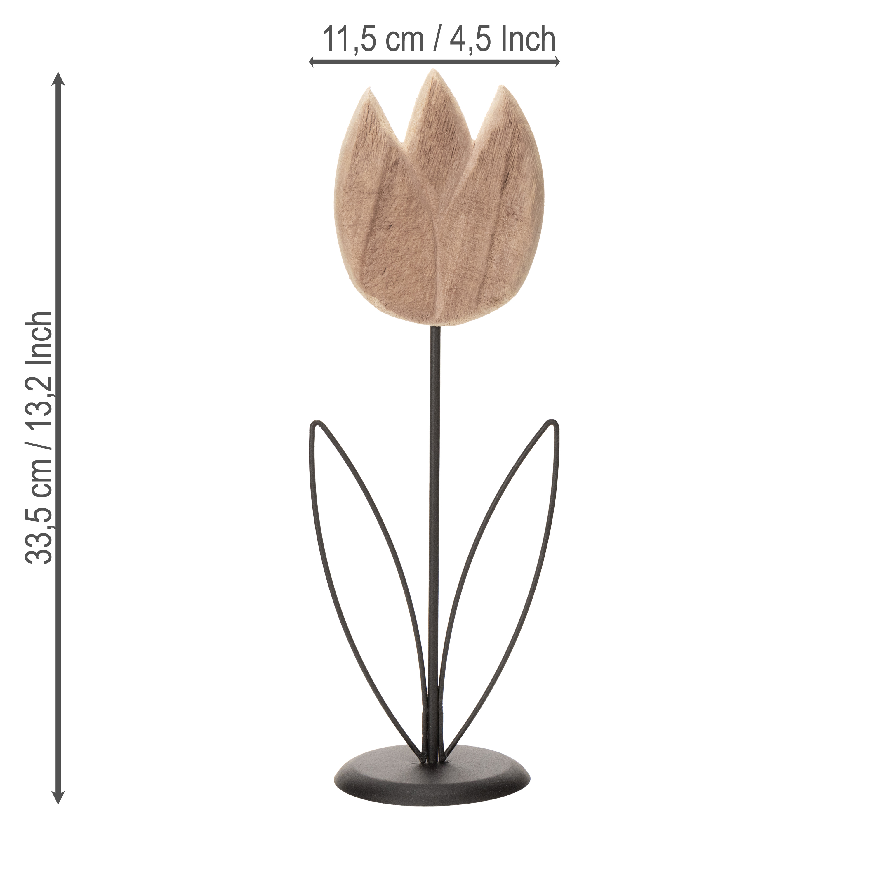 Detta tulpandekorationsföremål utmärker sig genom sin enkla men uttrycksfulla design. Det tulpanformade huvudet är tillverkat av högkvalitativt trä, vars naturliga ådring ger det ett särskilt autentiskt utseende. Blad, stjälk och bas är tillverkade av robust metall, vilket garanterar stabilitet. Oavsett om du föredrar en modern, skandinavisk eller tidlös inredningsstil, smälter denna dekorativa tulpan sömlöst in i alla miljöer. Den ser särskilt vacker ut i kombination med andra dekorativa föremål av metall eller trä – till exempel i ett litet arrangemang med ljus eller vaser.