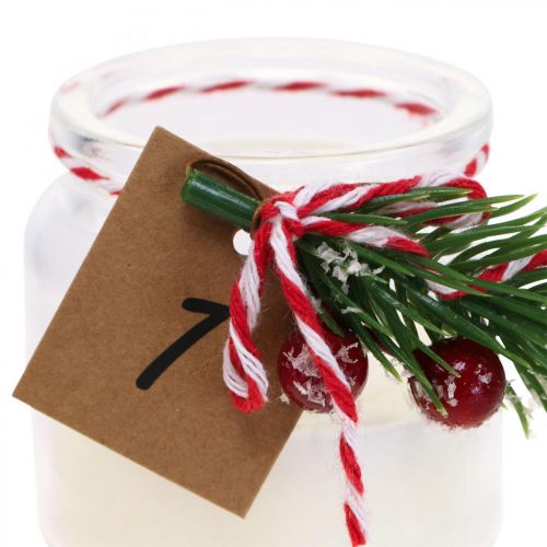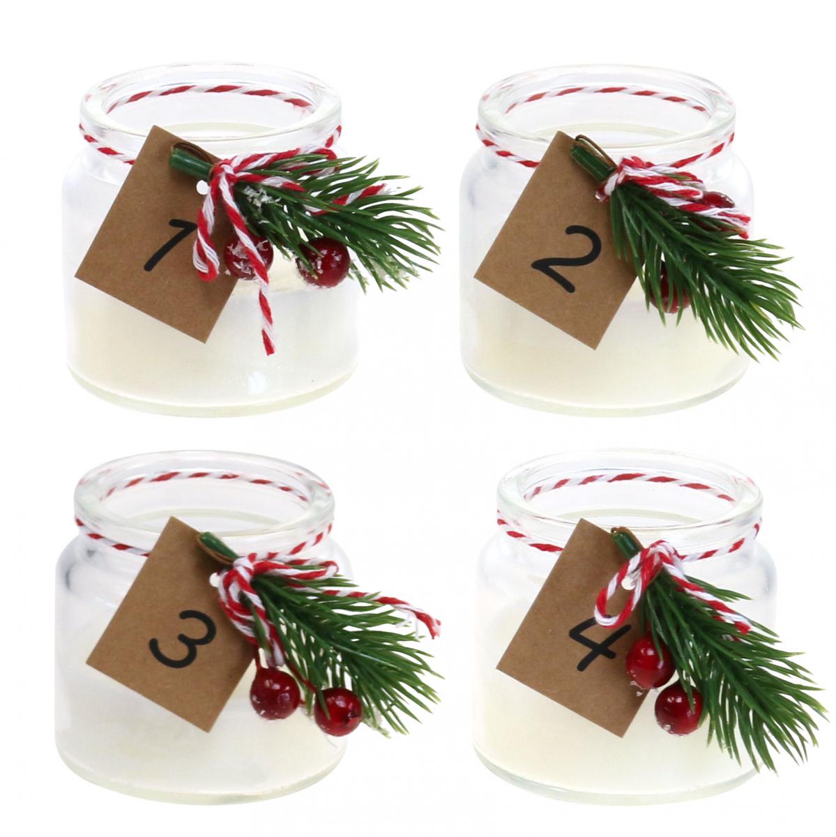 Denna värmeljushållare i glas kommer med ett ljus och kommer i en förpackning om fyra. Så du har också rätt antal ljus till advent.Ett röd- och vitrandigt band pryder ljusglaset. En liten grön tallgren och en gren med små järnekbär är knutna till bandet. Glittret på den gör att kvistar och bär ser isiga ut. Ett litet kartongkort visar siffran 1 till 4. Det är trots allt bara ett ljus som tänds varje söndag under advent.
