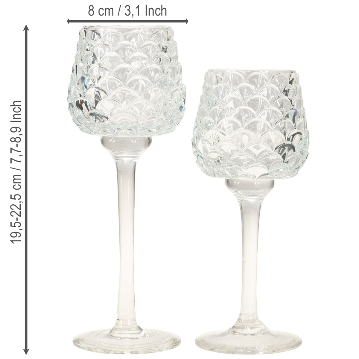 Setet "Teljushållare i glaskon med bas" består av två hållare i olika höjder, cirka 19,5 cm och 22,5 cm höga. Det högkvalitativa, klara glaset imponerar med sin konformade struktur och smälter diskret in i alla miljöer utan att förlora sin lyster. Baserna ger hållarna elegans och säkerställer stabilitet – en smart detalj som är lika praktisk som den är snygg.